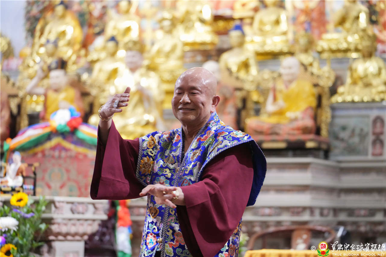 解答弟子的疑問後,法王繼續講解【維摩詰經】佛國品第一中的「爾時,一切大眾,睹佛神力,歎未曾有!合掌禮佛,瞻仰尊顏,目不暫捨。長者子寶積,即於佛前,以偈頌曰。」