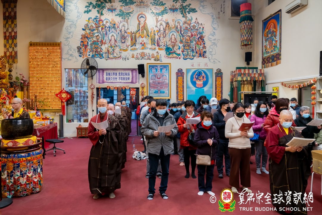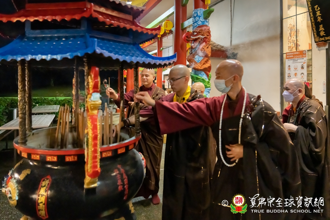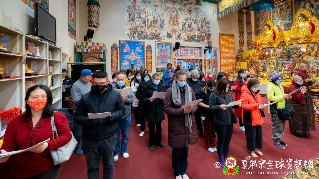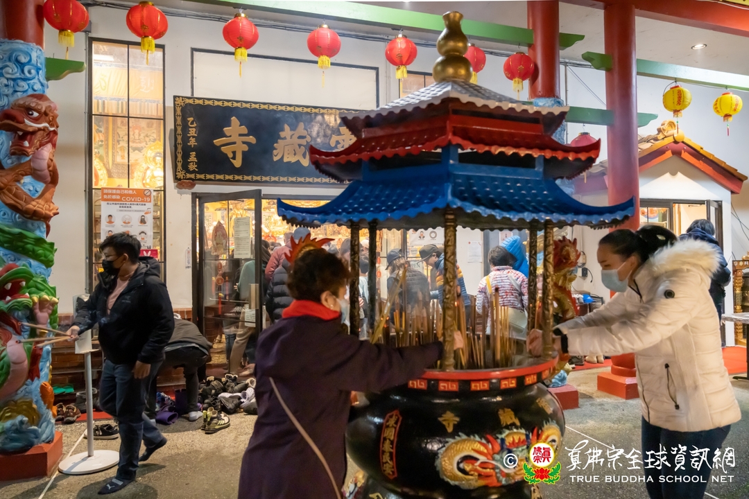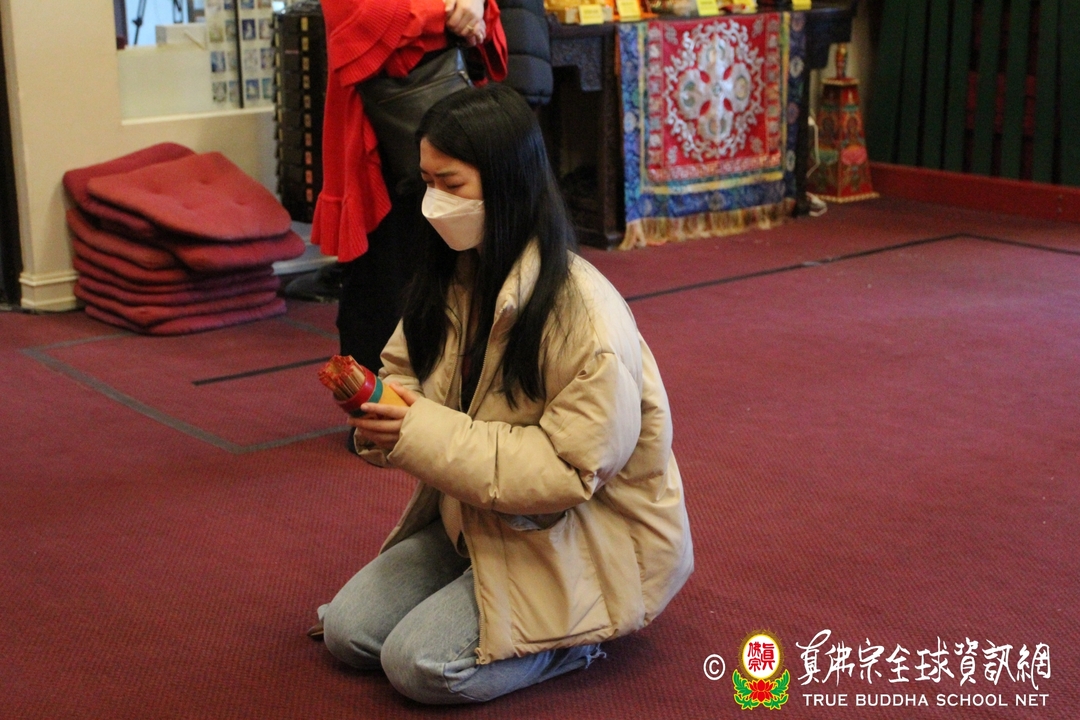 人潮不斷湧入大雄寶殿,全寺幾乎塞滿了上香禮佛的人,大家不怕夜黑,誠心前來西雅圖雷藏寺禮拜諸佛菩薩金剛護法神眾。到了晚上十點半,佛前大供儀式正式開始,丹增加措仁波切和住持蓮吟法師帶領唱誦,蓮明法師敲打鐘鼓,梵聲悠揚,完美地搭配著樂器,眾人很快進入狀態,莊嚴而專注地跟唱佛號佛咒與佛經讚偈,祈求諸佛菩薩加持眾等心想事成。佛前大供結束後,住持蓮吟法師和丹增加措仁波切、眾法師們率先到廟前的香爐上頭柱香,所有大眾滿心歡喜地跟著一同上香,為新的一年祈福許願。最後每個人臉上都掛著滿意的笑容,帶著供品開心地回家,儀式圓滿落幕。有的同門意猶未盡的燃燈供佛,跪在壇城前虔心祈求佛光注照新的一年吉祥如意,有的同門繼續歡聚在一起,留在廟裡跨年夜。法師們不辭辛勞的全天招待香客,一直忙到淩晨兩點才結束。