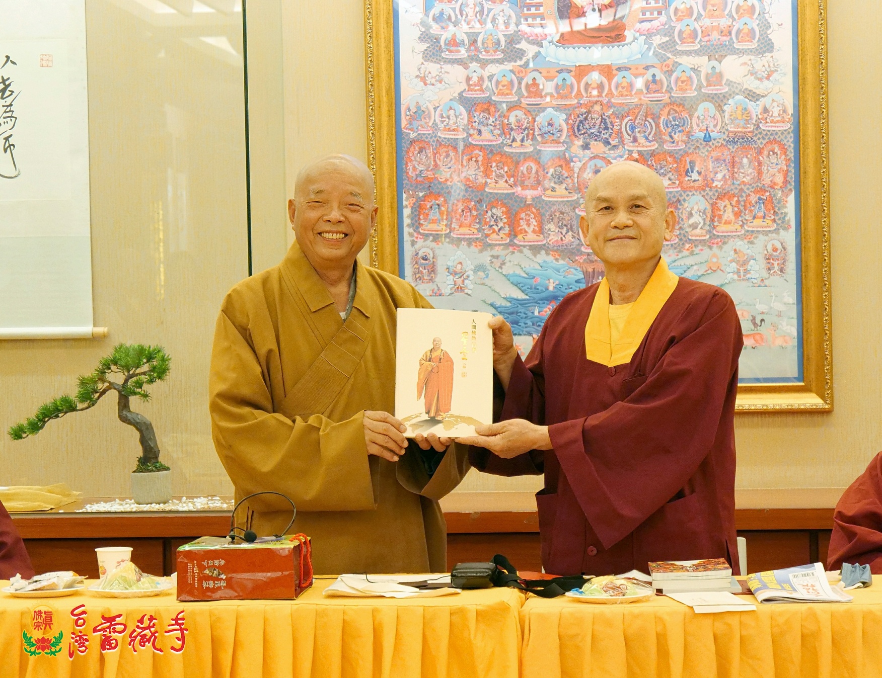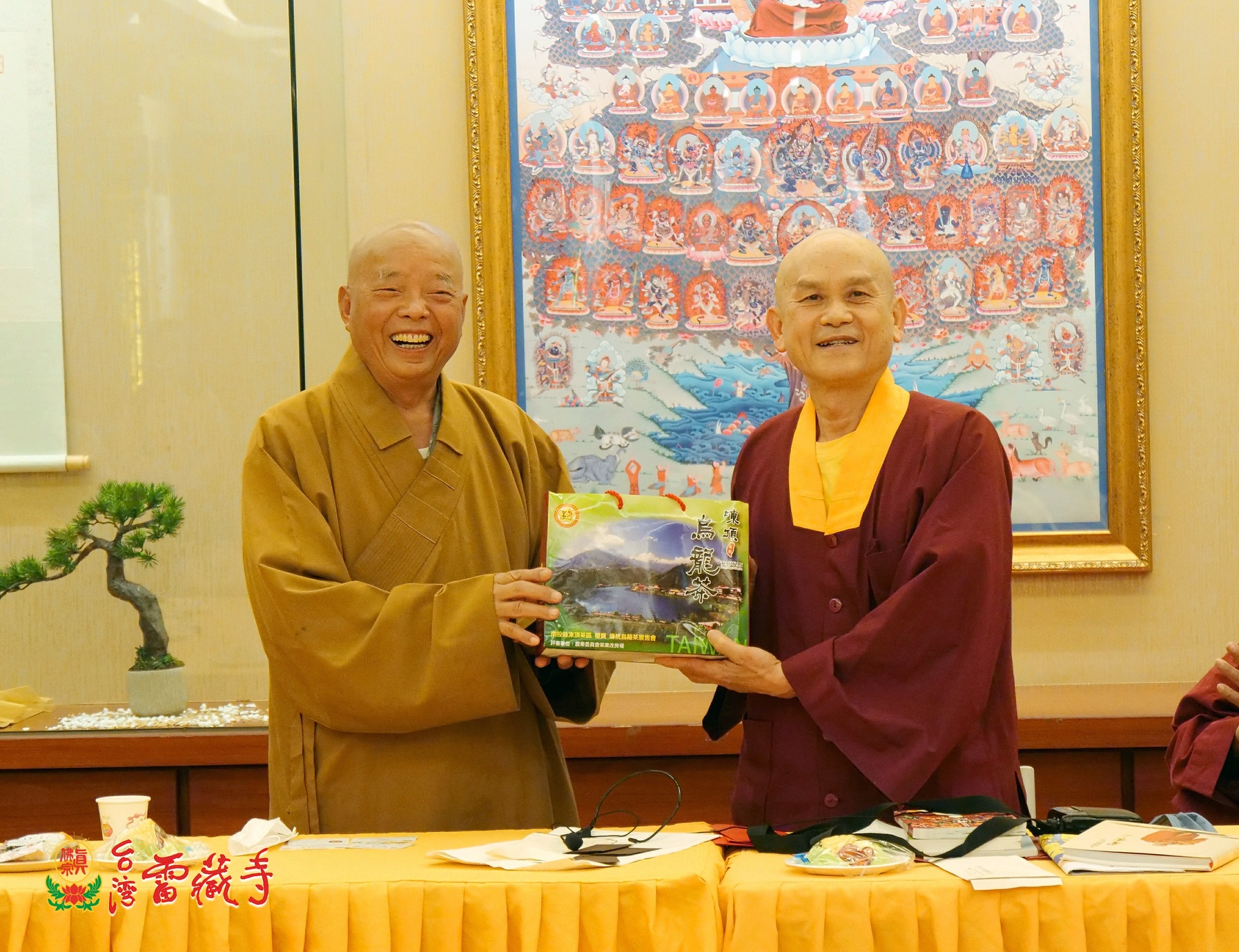 席間,釋慧龍法師代表向台灣雷藏寺致贈星雲大師的法語書籍、佛光刊物「人間福報」及烏龍茶禮盒,以表對於前來拈香的感謝;同時,台灣雷藏寺住持也回以真佛宗根本上師蓮生活佛的著作文集作為回禮。