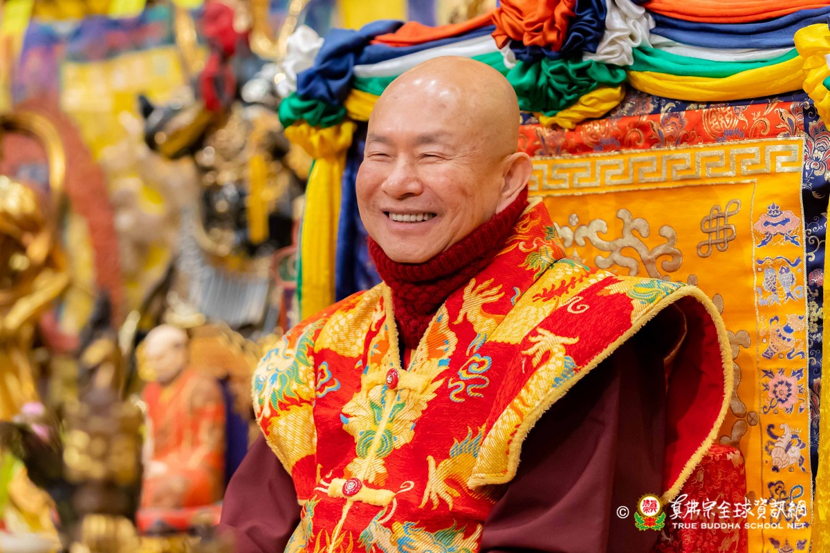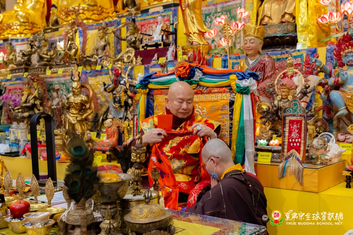 聖尊精彩寶貴的法語開示後,慈悲為新皈依弟子做皈依灌頂,並加持大悲咒水、開光佛像,及持拂塵加持與會眾等。