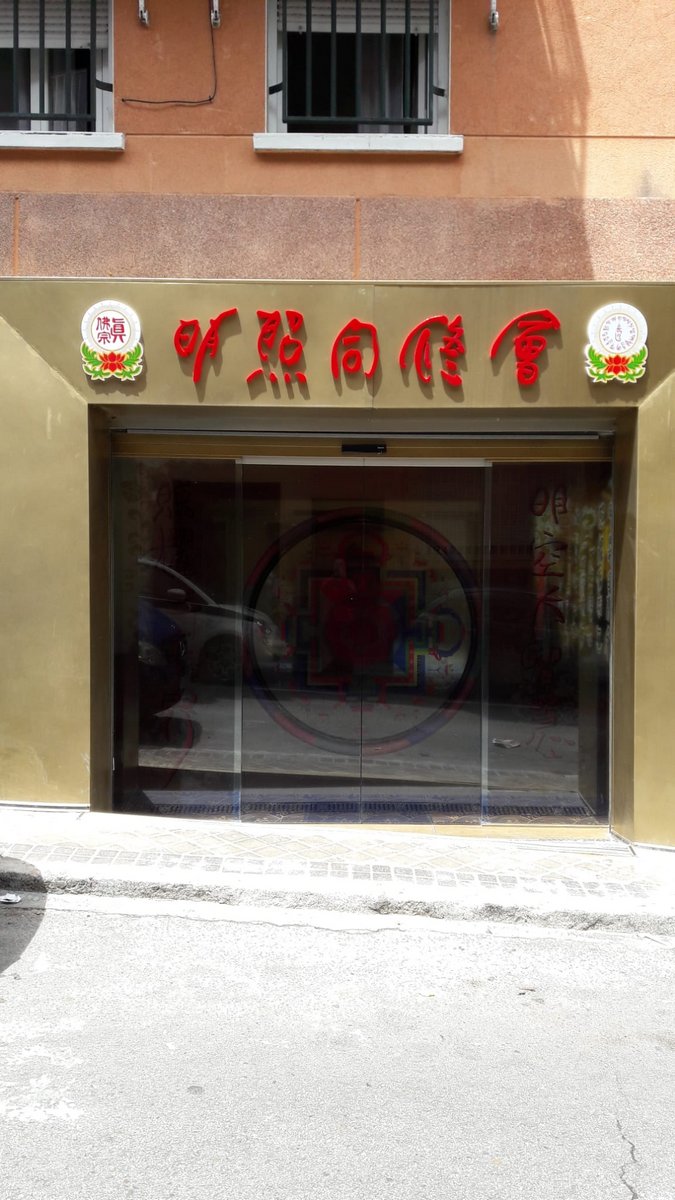 明照同修會的入門處,以根本上師賜與的墨寶「明照同修會」鑲嵌在上,左右配上真佛宗標誌,這在非中文為主的馬德里,可說是很特別的圖騰吧!