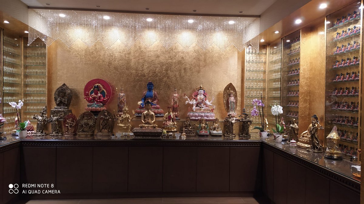 明照同修會的主壇城共有三層,最上層以七佛為尊,第二層中尊為真佛宗所尊崇的瑤池金母,接下來第三層為蓮花童子為中尊,壇城精緻莊嚴,搭配金色背牆,在投射燈光的照耀下,每一尊佛菩薩金剛護法都是顯得活靈活現。