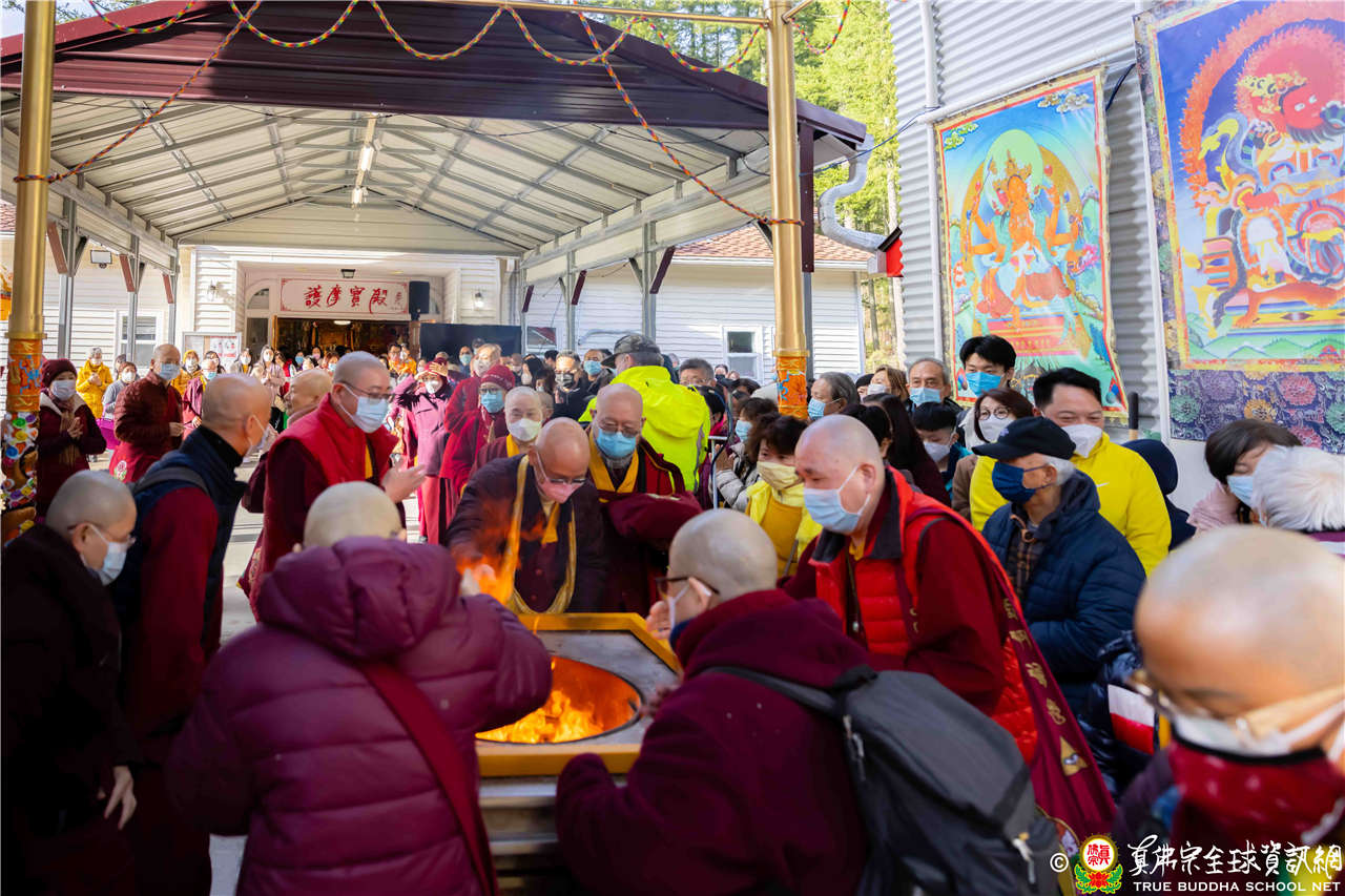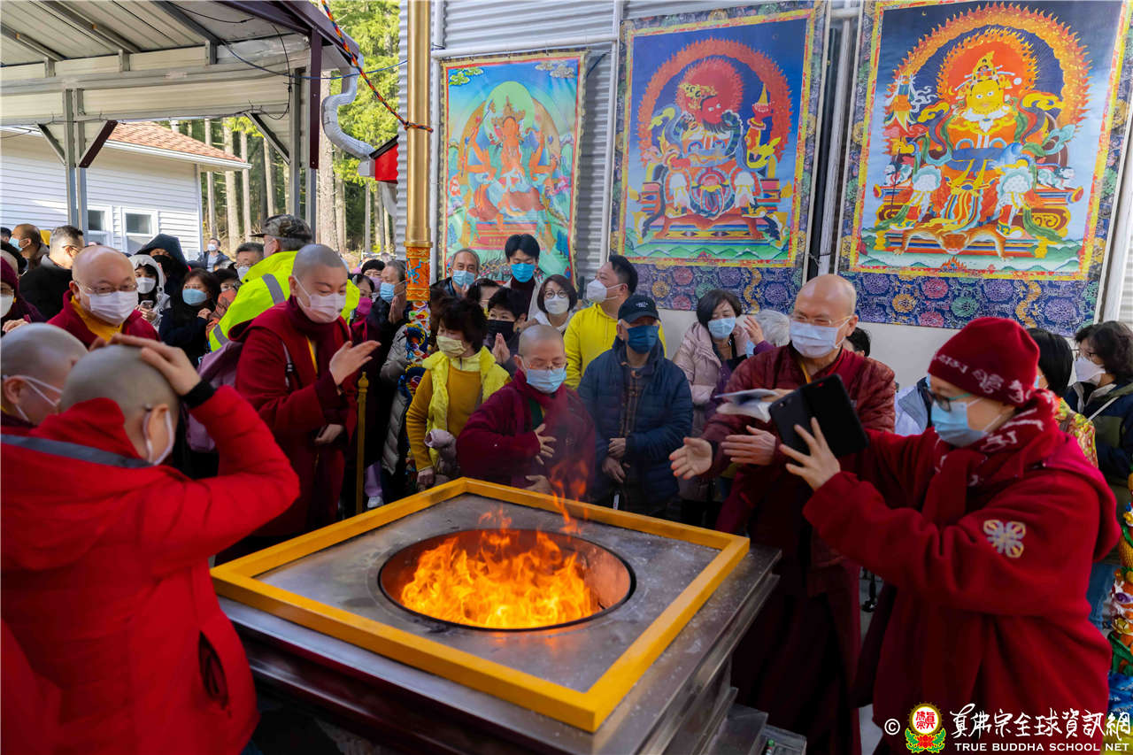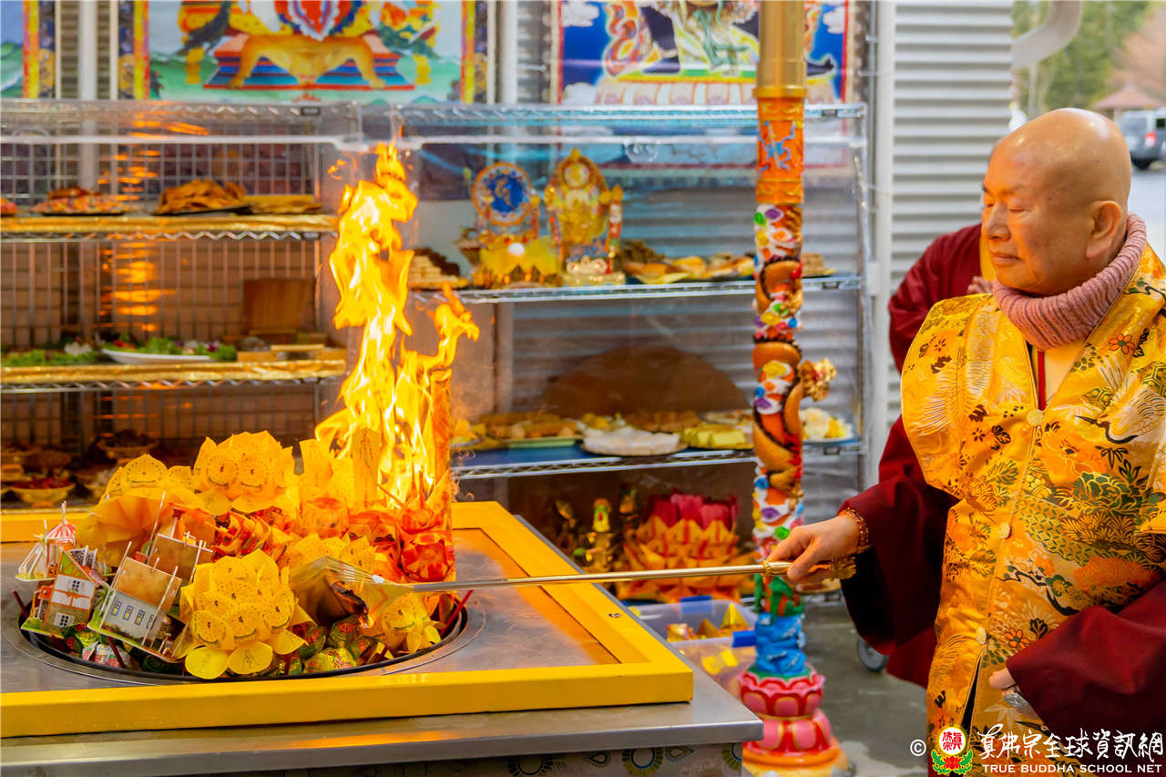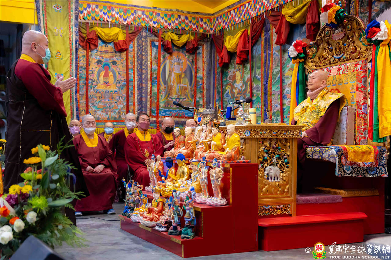 2023年4月2日,西雅圖彩虹雷藏寺恭請聖尊蓮生法王,主持南摩紅地藏王菩薩護摩法會。法王首先向大家預告,下週是尊勝佛母護摩法會。尊勝佛母的法力相當於準提佛母,無論是印度、西藏、中國,都屬於大佛母,且千變萬化。尊勝佛母有一字咒:「嗡。普隆」,力量很大。圓滿咒「嗡。部林」是普方上師所傳,其實也就是「嗡。普隆」,二者是同樣的,是圓滿之意。