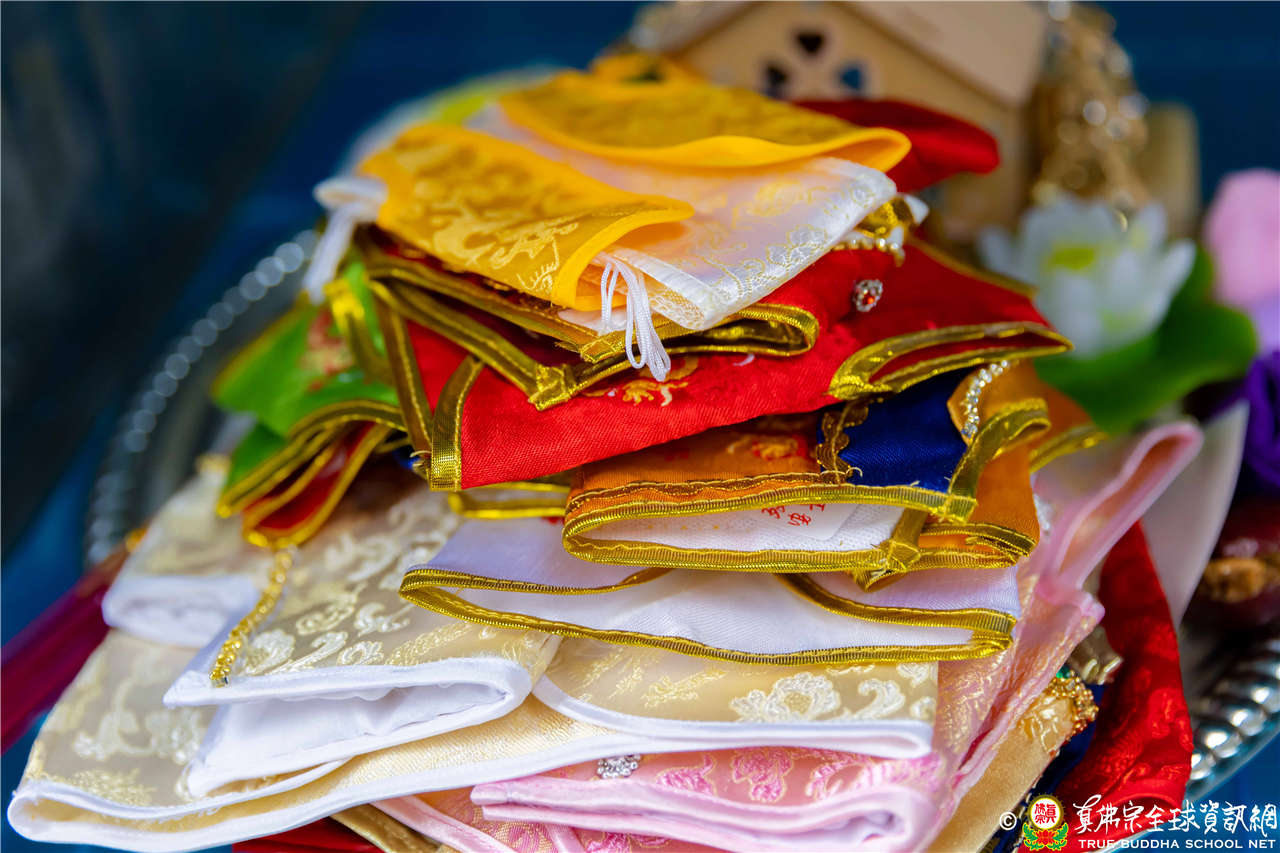 此時法船從法王的手中放入虛空中,一化十,十化百,百化千艘法船;請幽冥衆一一上船、祈請三根本在虛空放光加持法王,白、紅、藍三光加持,再放無量光加持,再請阿彌陀佛如來放光加持法船上的幽冥衆,幽冥衆一一清淨,霎那間法船飛騰到天外之天。