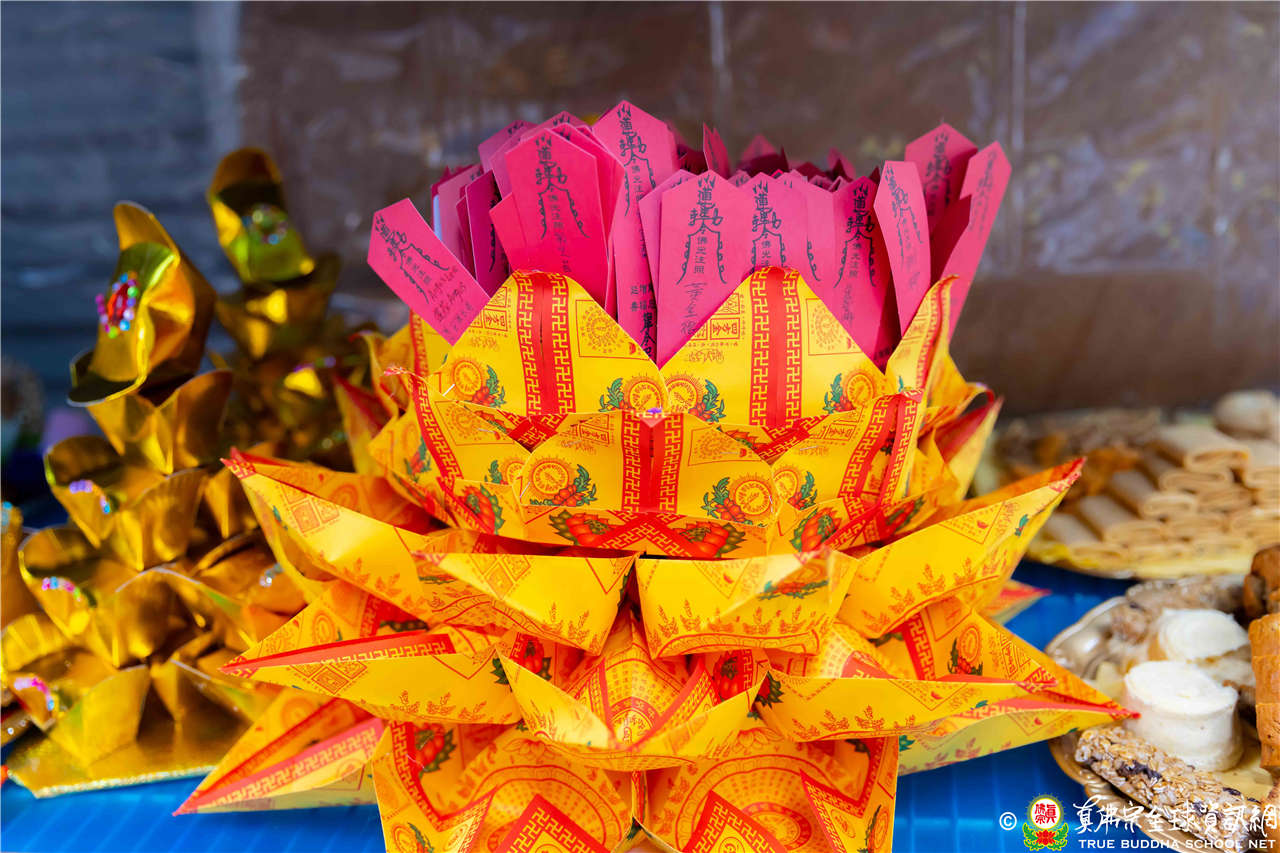 頃刻間,法船由三根本接引,抵達淨土,所有幽冥衆登上彼岸。幽冥衆禮拜西方三聖阿彌陀如來、觀世音菩薩、大勢至菩薩;聽聞和雅音,所有幽冥衆自然唸佛、唸法、唸僧,修持「三十七道品」,將來個個成佛!法王再請瑤池金母、虎頭金剛、阿彌陀佛放光加持!請地藏王菩薩摩尼寶珠放光加持:心想事成,身體健康,萬事如意,修法成就!法王敬禮觀世音菩薩,菩薩以楊枝淨水,遍撒三千世界!敬禮大勢至菩薩,持含苞蓮花,放黃光讓資糧具足;放紅光讓敬愛圓滿; 最後法王請三根本及所有眷屬護法等加持,修持千艘法船一切圓滿,唸「嗡。普隆」三遍,然後行咽液、納氣、開五輪,入定等法。