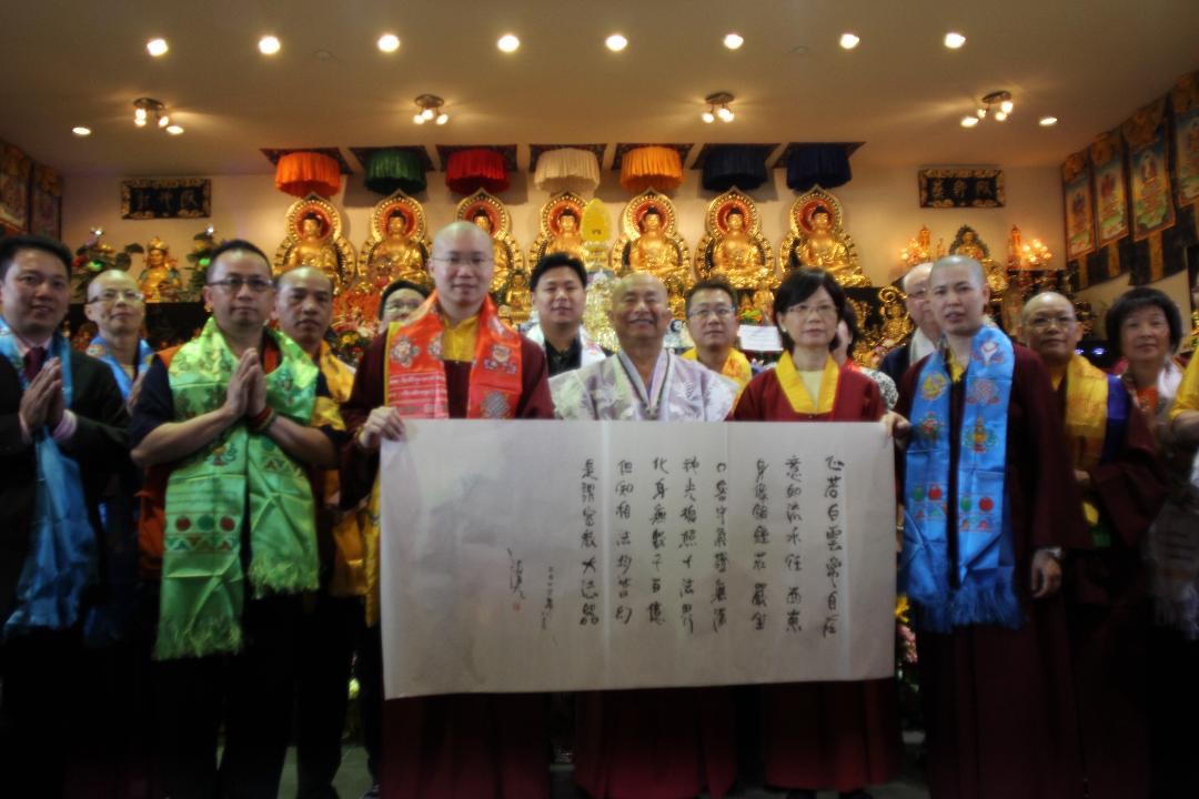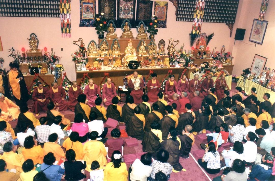 1994年8月6日,聖尊應邀為剛落成具密宗色彩的「白雲雷藏寺」開光及剪彩,同行有八位上師、兩位法師。開光當天,天降微微甘露,將8月浩熱的卡城,變得一片清凉,暑氣全消。當9時正,聖尊車隊蒞臨白雲雷藏寺時,大日從雲層中沖破,頓時陽光普照,光芒萬象一片吉祥。寺外人山人海,喜氣洋洋,隨着聖尊金剪一揮,紅布卸下,露出了金光閃閃的「白雲雷藏寺」横匾,同時也象徵白雲雷藏寺弘法度眾的新開始。當天聖尊賜下墨寶「深入禪定是法王 白雲深處樂仙家」,並賜受出家戒和菩薩戒。