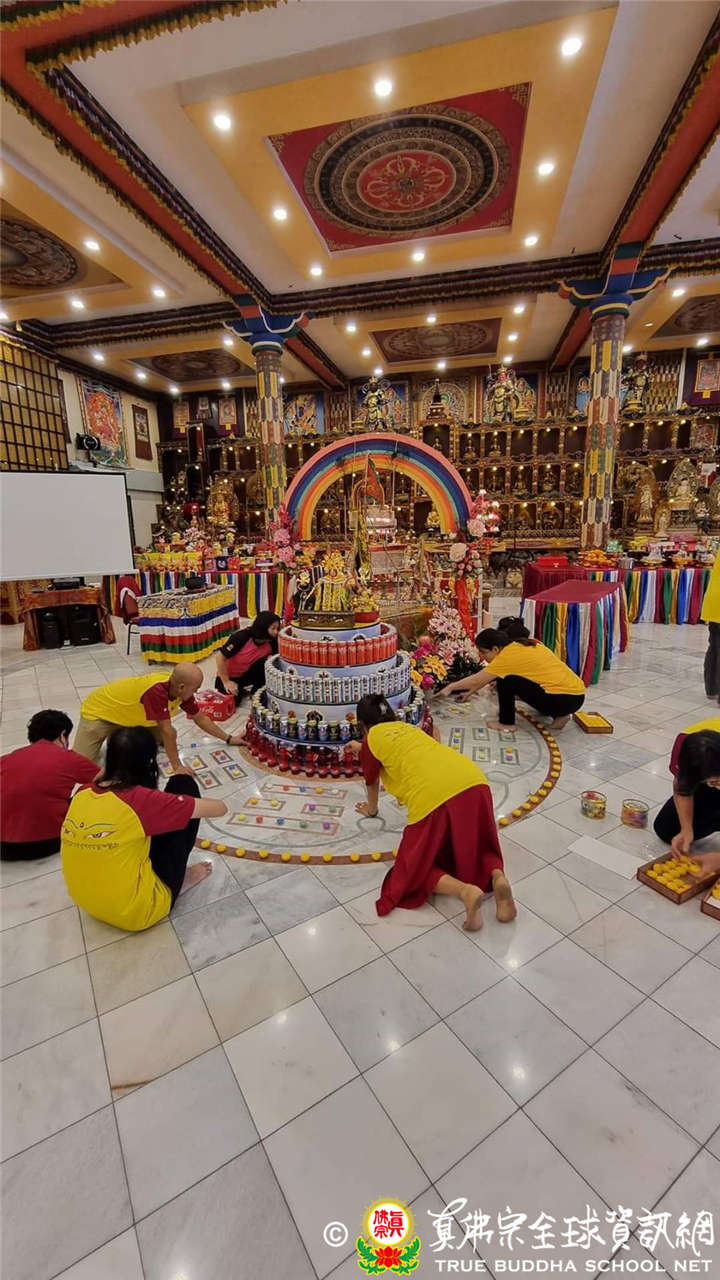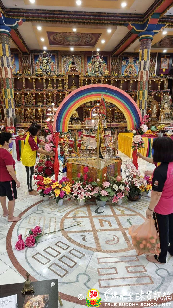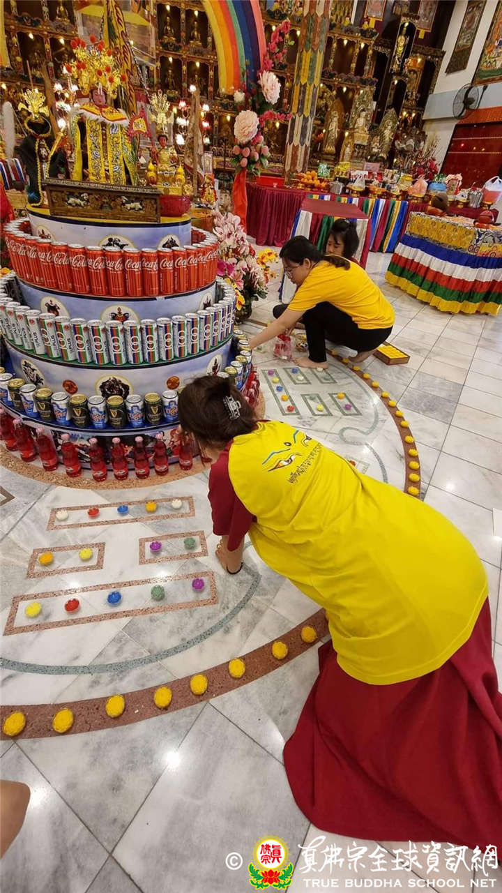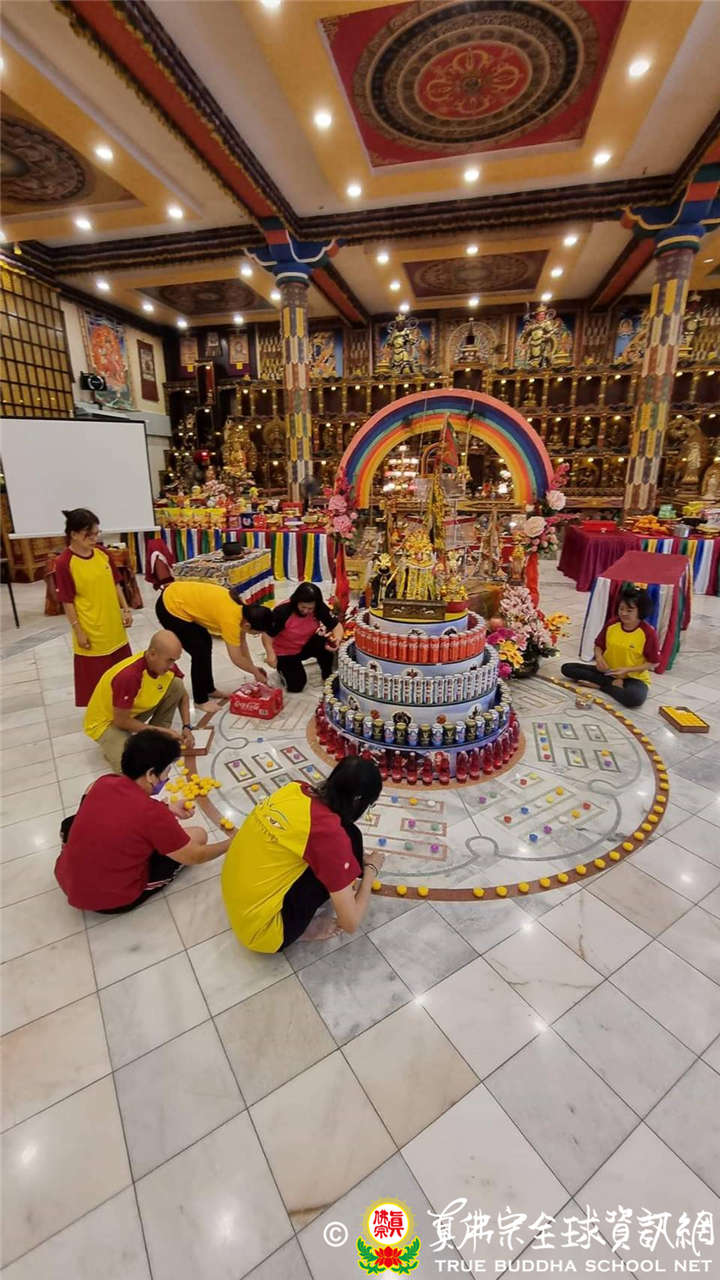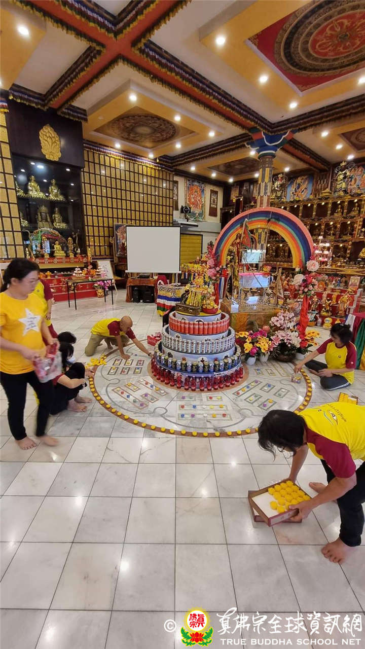 在馬來西亞真佛宗怡保雷藏寺,同門互相合作帮助为準備6月24日全球真佛宗水供大法會佈置金母水供莊嚴壇城。