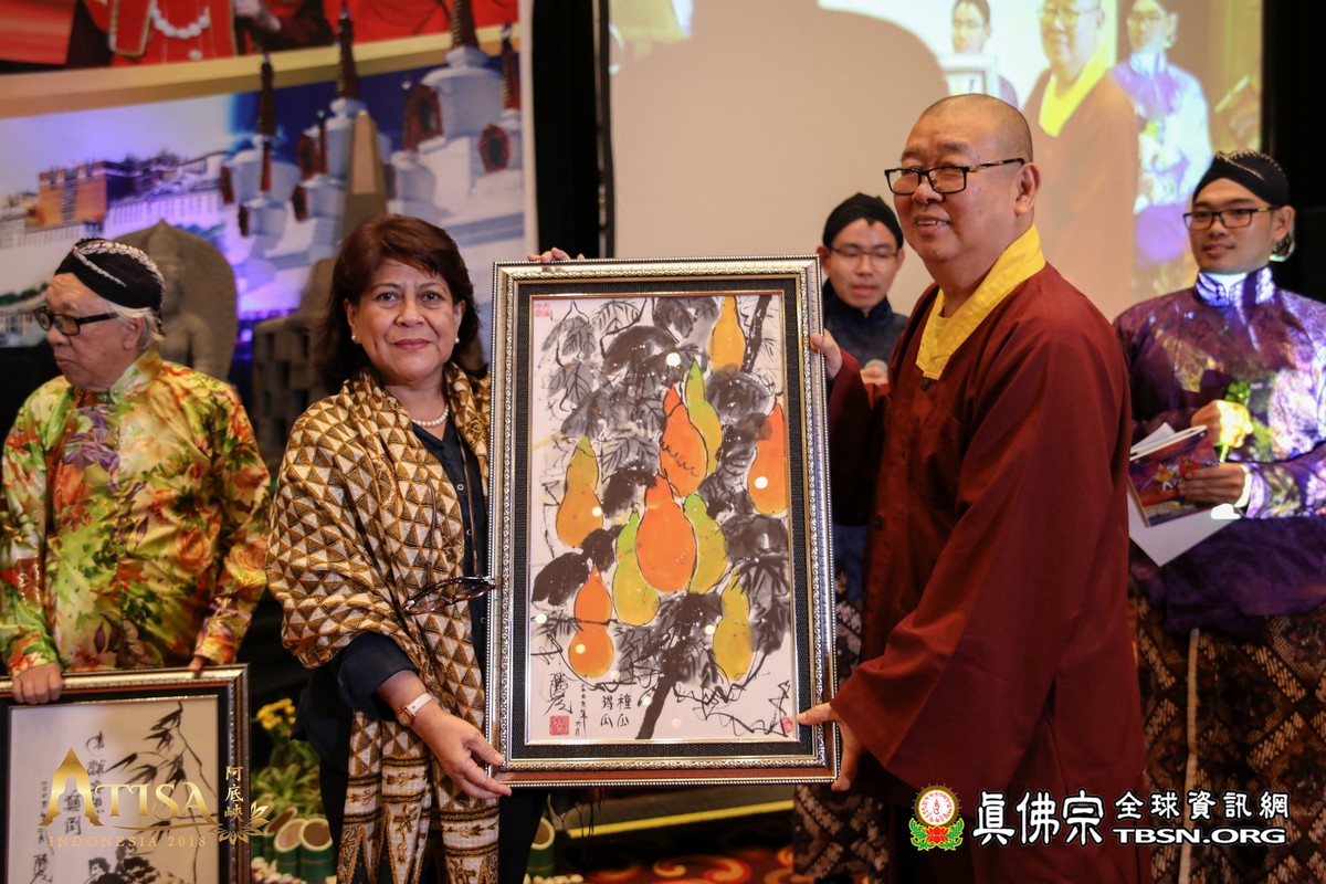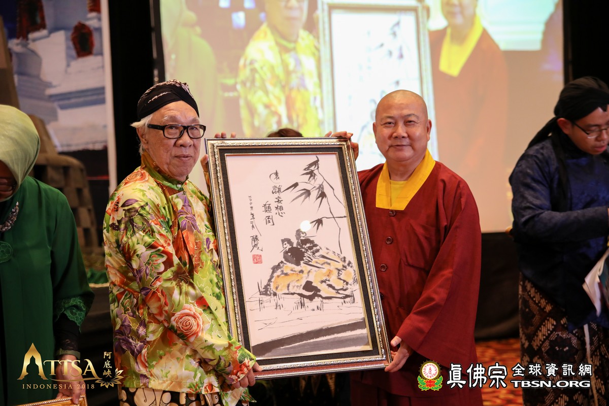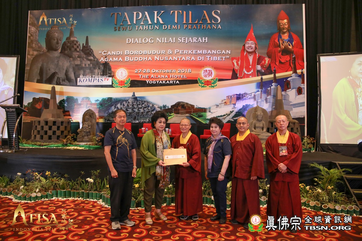 在所有致詞結束後,世界宗務委員會及印尼真佛宗密教總會、印尼真佛宗密教總協會,共同致贈5億元印尼盾給印尼佛教總會(WALUBI),用以協助印尼蘇拉威西海嘯重災區巴路(Palo)的賑災與重建,由總會長鄒麗英女士代表接受贈與。同時,主辦單位也將多幅蓮生活佛所創作之墨寶畫作,致贈予蒞臨活動的嘉賓們。場面歡愉溫馨,與會大眾無不希望下次的講座活動能早日舉行,讓大眾能再以多種不同角度來接近佛法、深入智慧,也期待聖尊蓮生活佛於12月佛駕印尼,主持12月8日於印尼雅加達地區舉行的阿底峽尊者大法會,並蒞臨印尼各地多處道場,以佛光加持這個千島之國。