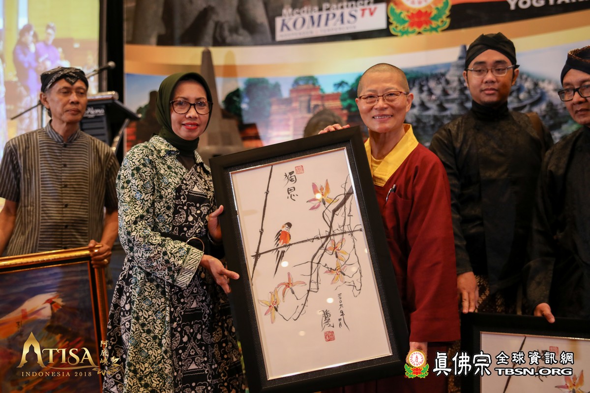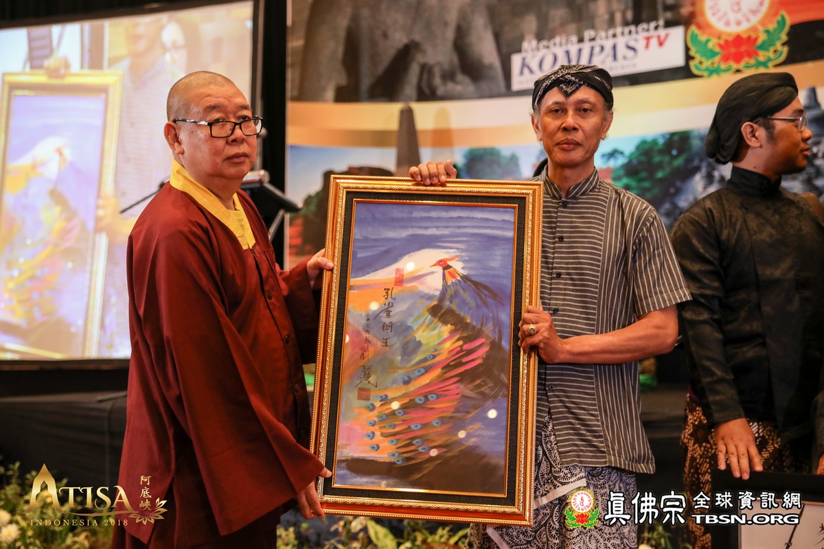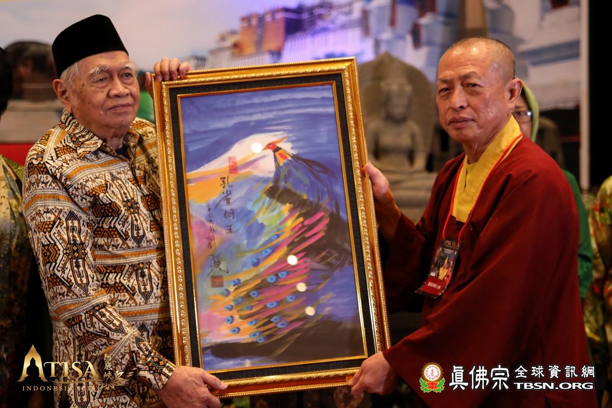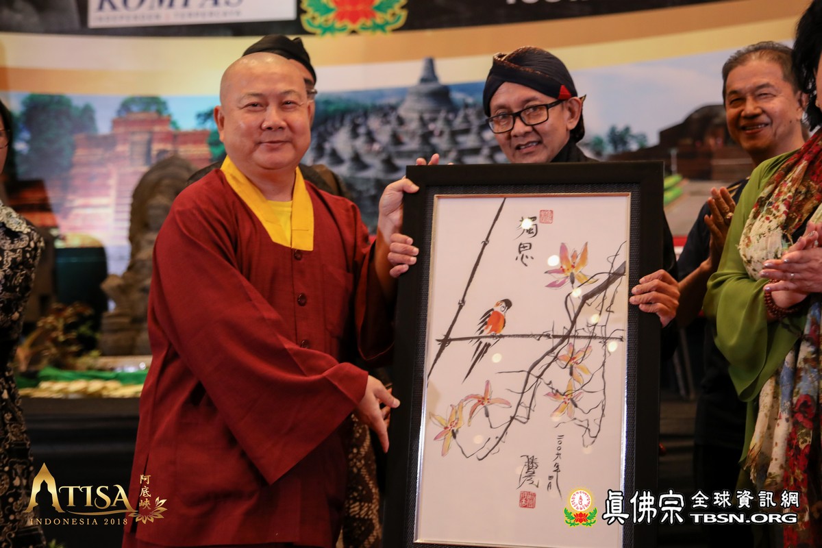 在所有致詞結束後,世界宗務委員會及印尼真佛宗密教總會、印尼真佛宗密教總協會,共同致贈5億元印尼盾給印尼佛教總會(WALUBI),用以協助印尼蘇拉威西海嘯重災區巴路(Palo)的賑災與重建,由總會長鄒麗英女士代表接受贈與。同時,主辦單位也將多幅蓮生活佛所創作之墨寶畫作,致贈予蒞臨活動的嘉賓們。場面歡愉溫馨,與會大眾無不希望下次的講座活動能早日舉行,讓大眾能再以多種不同角度來接近佛法、深入智慧,也期待聖尊蓮生活佛於12月佛駕印尼,主持12月8日於印尼雅加達地區舉行的阿底峽尊者大法會,並蒞臨印尼各地多處道場,以佛光加持這個千島之國。
