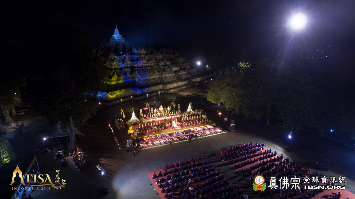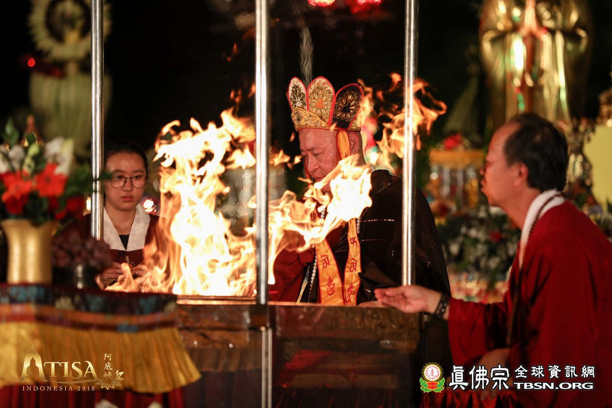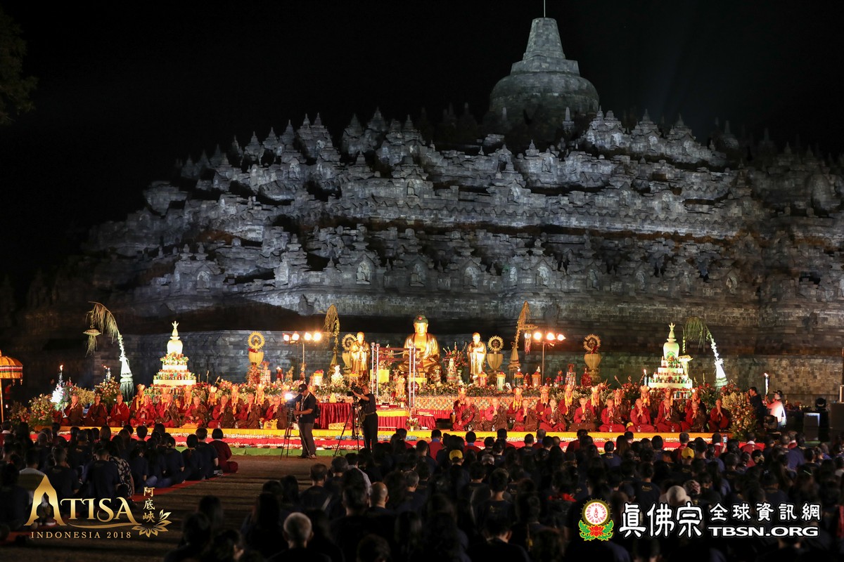 10月28日下午,與會大眾再次前往婆羅浮屠會場,參加由蓮僧上師主壇之「千手千眼觀世音菩薩護摩大法會」,為印尼國家祈福並為近日(9月28日)蘇拉威西島(Sulawesi)暨龍目地震海嘯的災民祈福超度。並由真佛宗上師團帶領與會大眾持誦大救難咒並繞塔、點燈為印尼國家祈福。