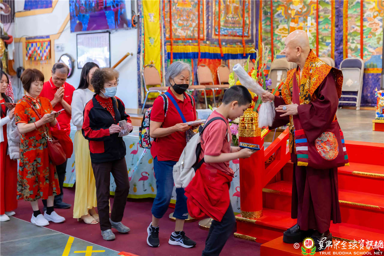 2023年6月25日,西雅圖彩虹雷藏寺恭請聖尊蓮生法王主壇長壽佛護摩法會。法王預告下個星期日護摩法會主尊為滿願童子,接著向大家講解滿願童子的咒語和手印。