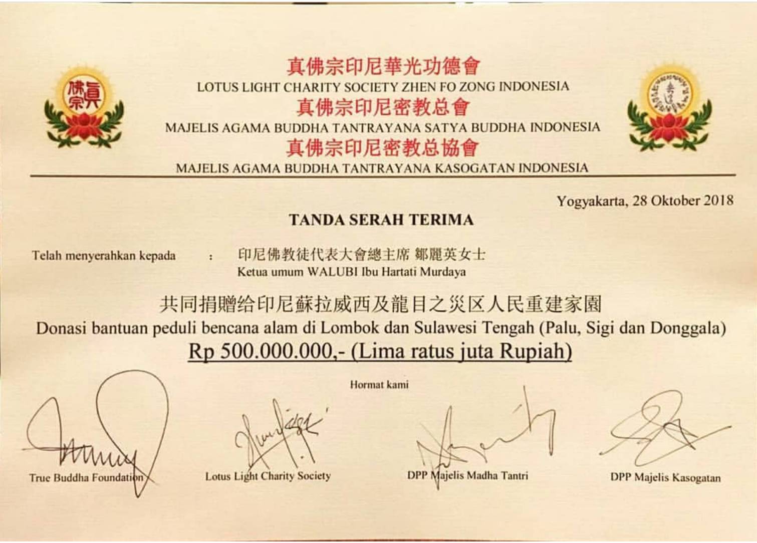 護摩後,蓮僧上師首先代表根本傳承上師,向中蘇拉維西及龍目島地震海嘯罹難受災者,致上最深的哀悼與慰問,聖尊也非常關心當地災區居民的健康與重建的工作等等。師尊並且慈悲指示,以宗派的力量,分別在印尼、台灣等地,啟建千手千眼觀音護摩來迴向給受災眾生與眾靈,聖尊自己也於彩虹雷藏寺護摩法會時為之迴向,期望在千手千眼大悲觀音慈悲攝受下,眾亡靈能遠離恐懼,得佛接引往生佛國,眾災區倖存者能夠早日重建家園,安居樂業。