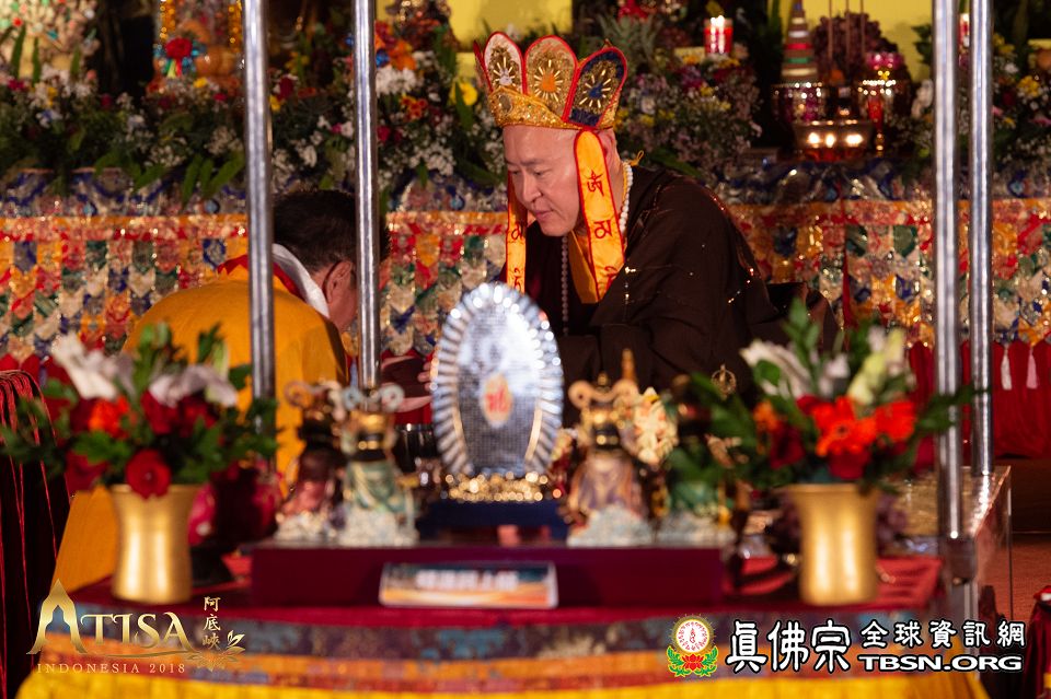 之前,宗委會處長與上師們共7位應邀為現場婆羅浮圖歷史性的珍貴佛像金身開光,象徵根本傳承法流,藉著本宗上師的代師傳法,也發光於當地。
