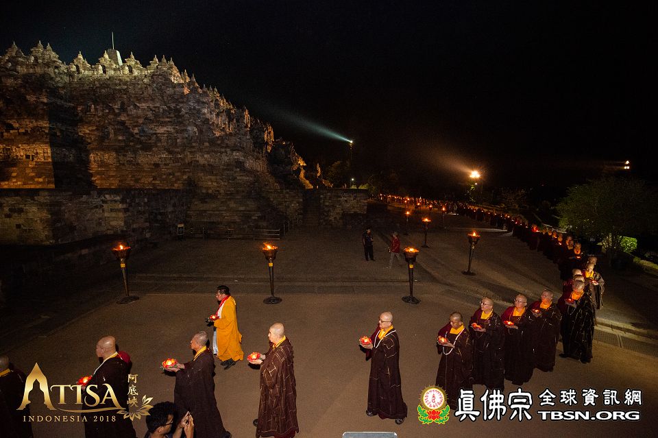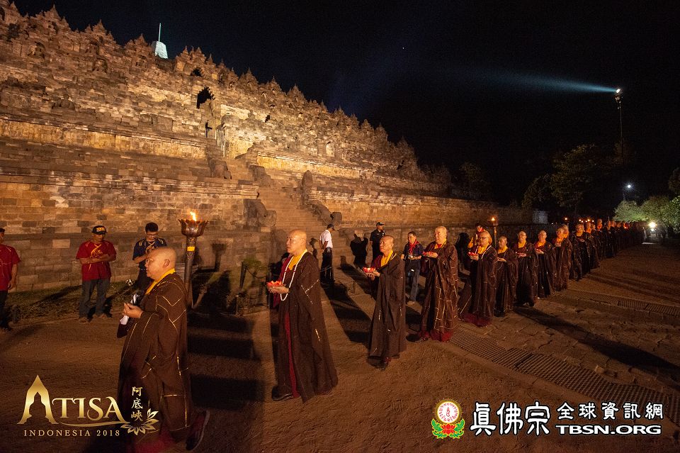 接著,在殊勝的「大救難咒」音樂之中,上師與各級弘法人員、與會大眾和貴賓們,一起虔誠一步一腳印地繞著婆羅浮圖佛塔,人人萬分殷重,觀想持咒繞佛。