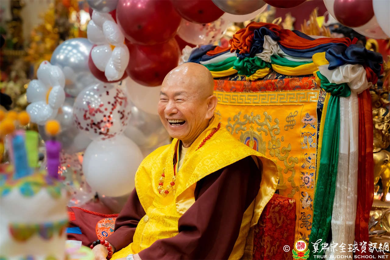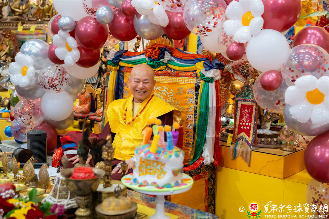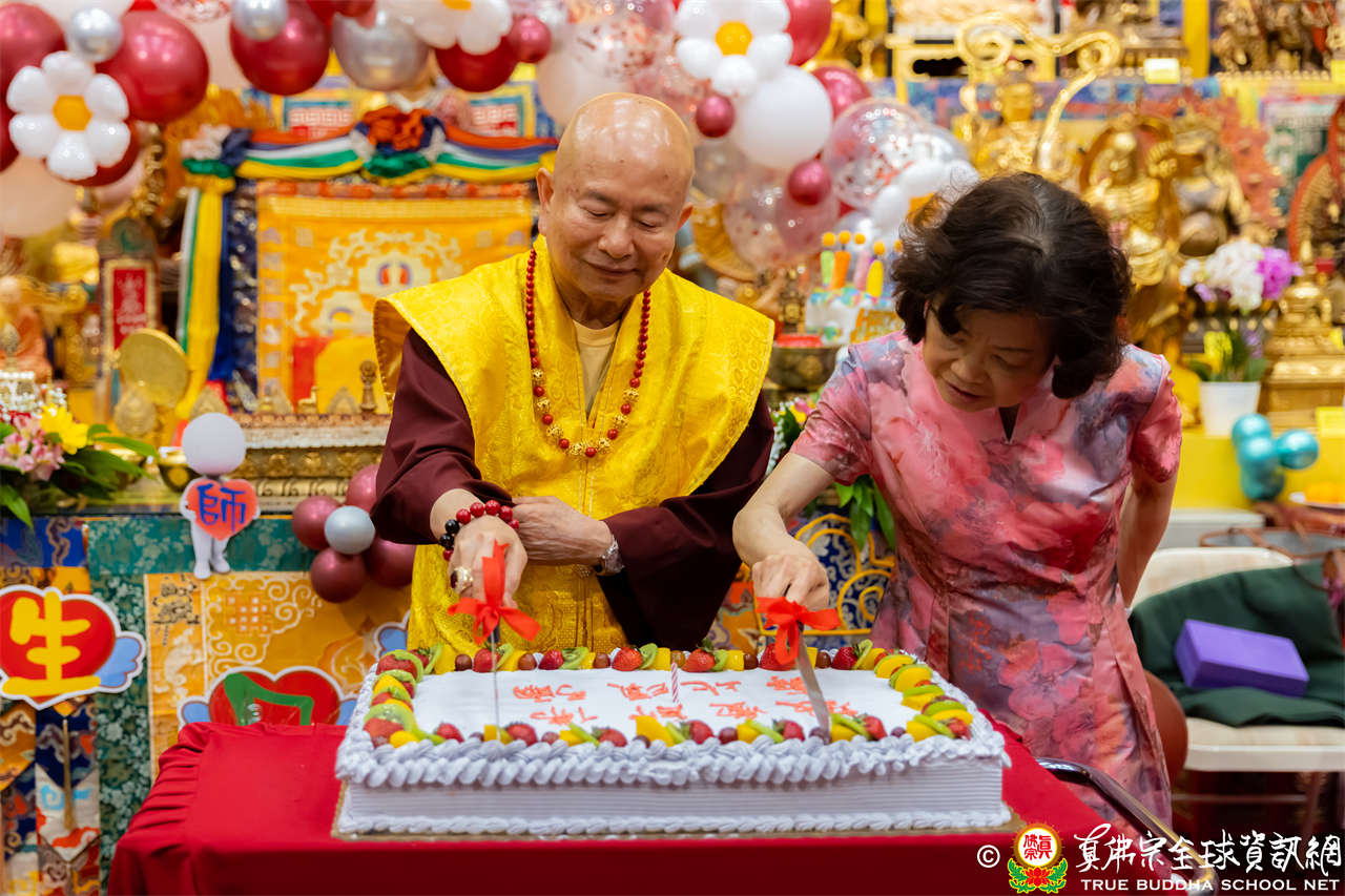 精彩的表演後,在歡樂的歌聲中,宗委會先向師佛獻上全部由新台幣百元大鈔製成的特製蛋糕,然後才送上特別訂製的實體蛋糕,大眾歡聲齊唱中、英及印尼文版的生日快樂歌,祝賀師佛佛體安康、快樂吉祥、福壽康寧、任運自在、長住世間、恒轉法輪。