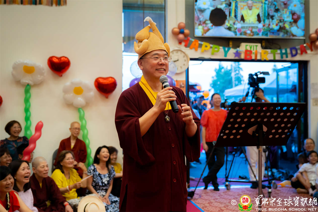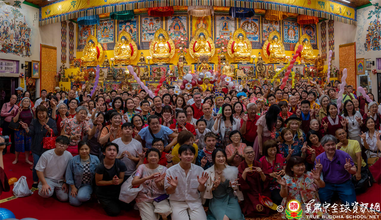 最後邀請師佛偕同師母與四眾弟子在壇城前大合影,壽誕慶祝晚會在弟子們的歡樂笑聲中,圓滿落幕。整場晚會,在主持人蓮訶上師和周慧芳律師二人聯手之下,猶如雙簧表演,二人妙語如珠,節目緊湊沒有冷場,以及別出心裁創意表演,師佛、師母整晚都樂開懷。師佛特別稱讚整場節目都很棒,最後在歡樂的『生日祝福歌』歌聲中,眾人才依依不捨的向師佛、師母道晚安。大家意猶未盡,彼此都情不自禁地相約明年師尊佛誕時,將再臨祖廟向師佛賀壽。