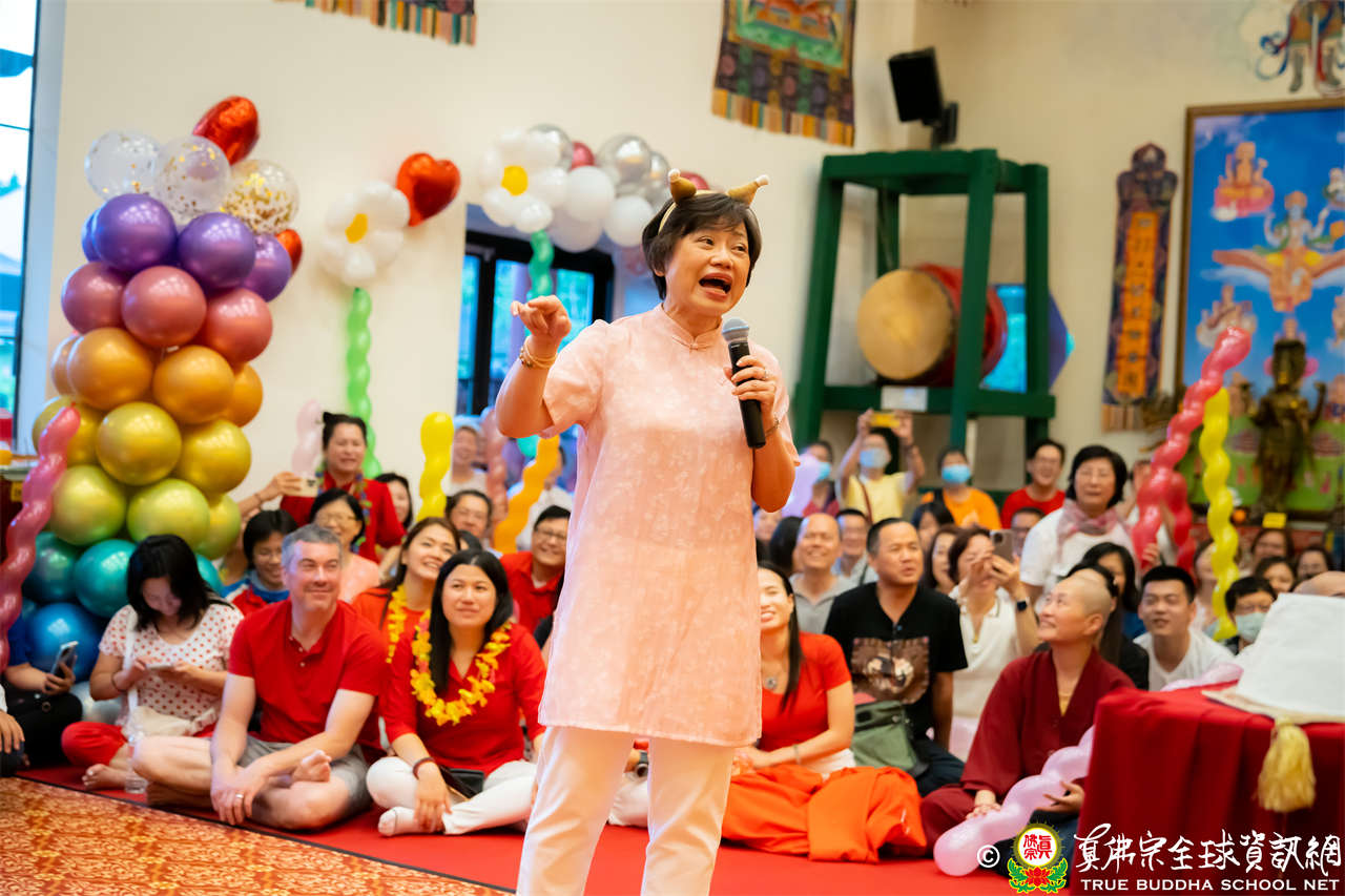 後由巴西真諦雷藏寺的阿靜師姐,以其專業的歌聲帶領全場唱誦「生日祝福歌」,與會弟子們跟著打拍子,為活動推上一波高潮。