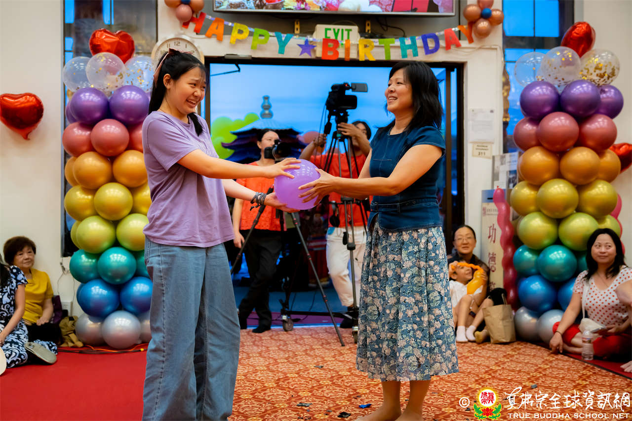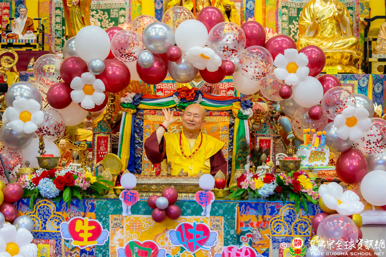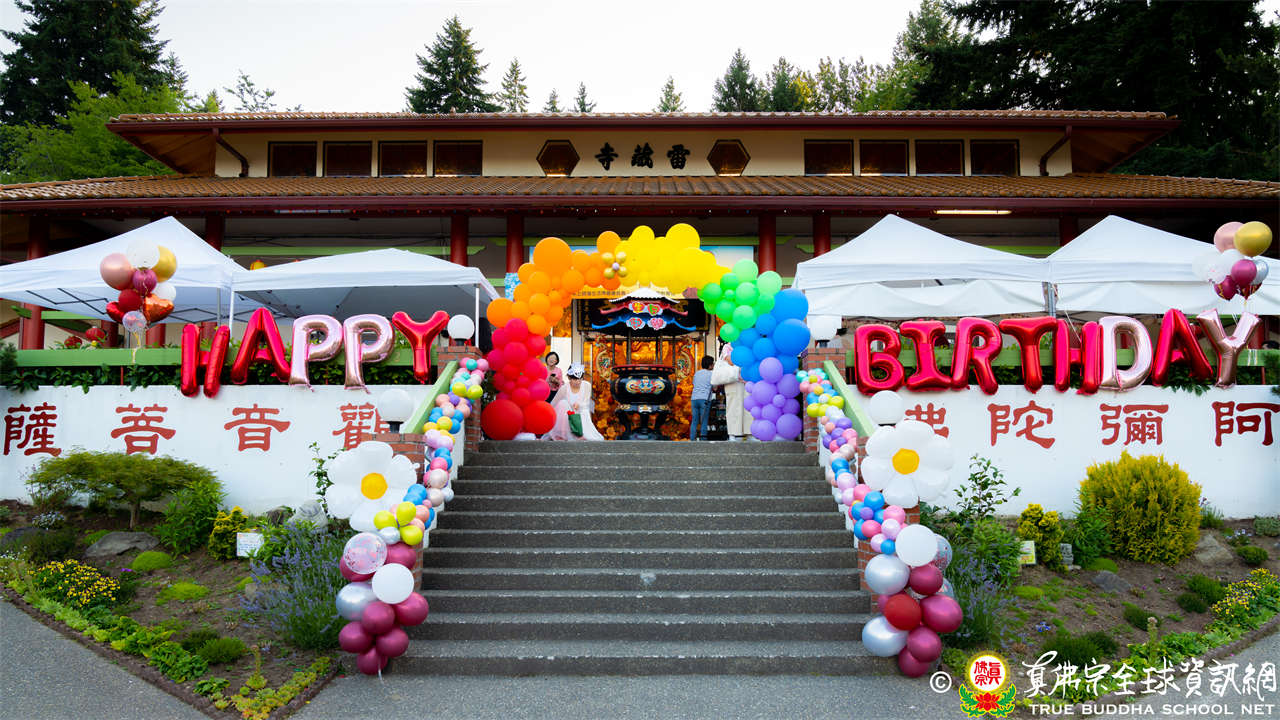 大殿外升起一個用七彩繽紛的汽球點綴而成的高聳的愛心大拱門,兩旁豎著紅白兩色的英文字HAPPY BIRTHDAY,扶手欄杆也飄揚著鮮花和汽球。大雄寶殿內鮮花錦簇、飄揚著色彩繽紛的汽球,各色各樣的供品佈滿壇城,處處洋溢著歡樂的賀壽氣氛。