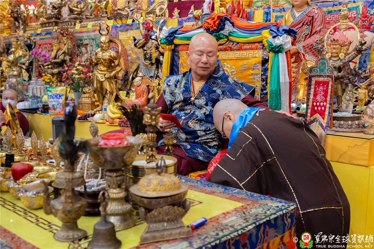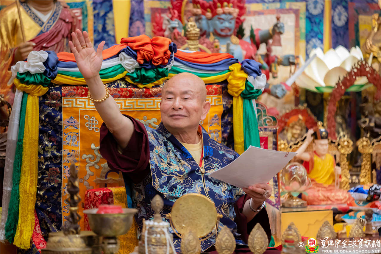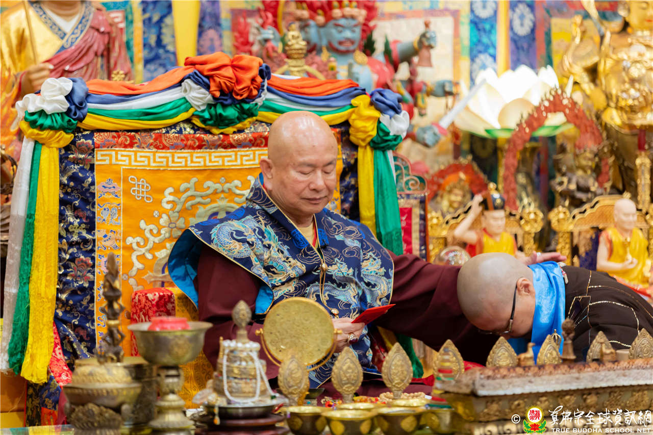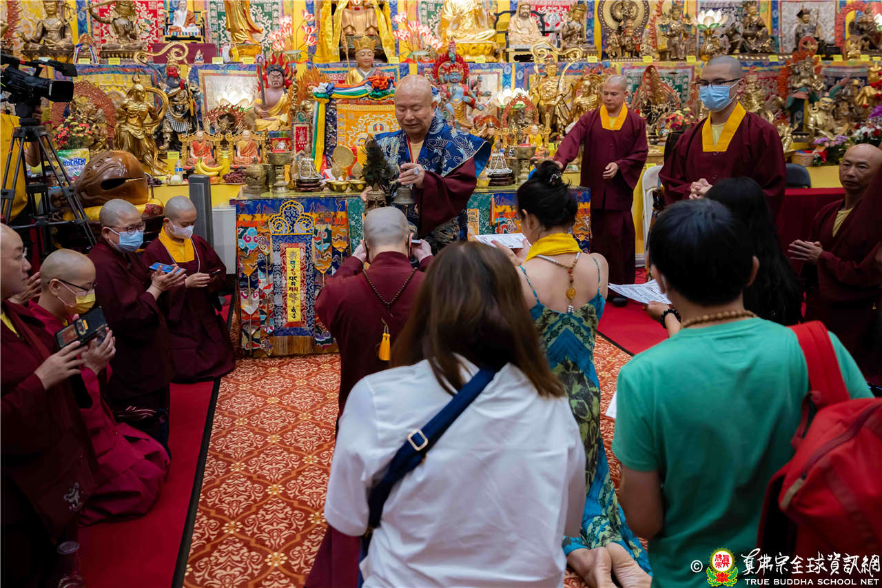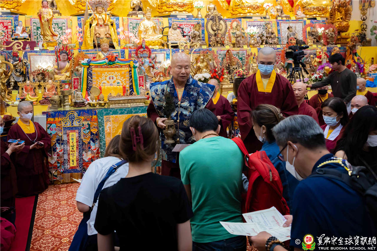 聖尊精闢的開示,令四眾弟子聽得津津有味,內心充滿法喜!聖尊給予皈依灌頂和加持後,大眾歡喜列隊,一一領受慈悲的聖尊以拂塵加持。