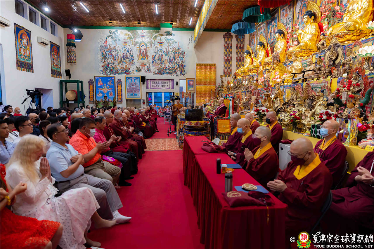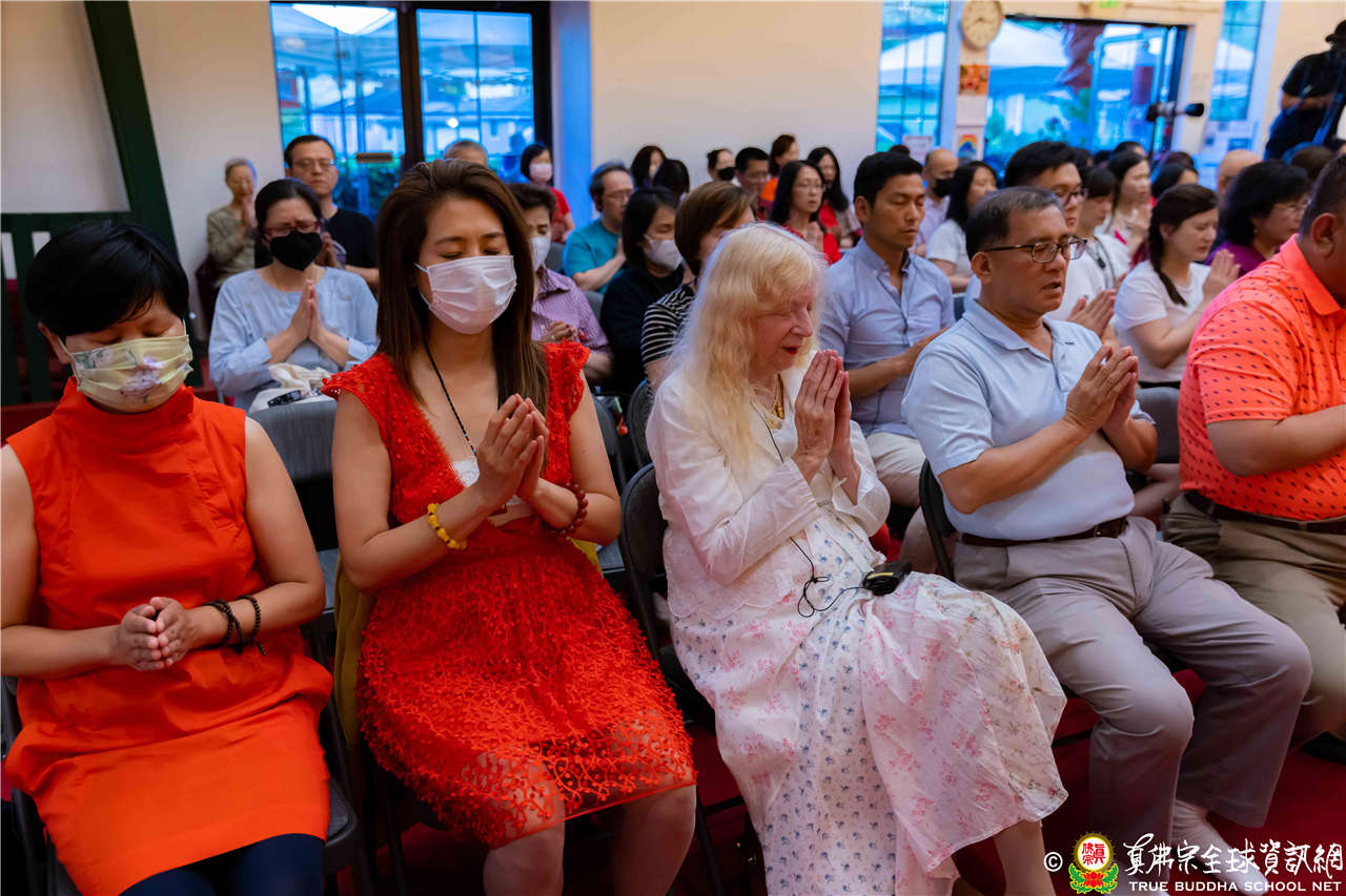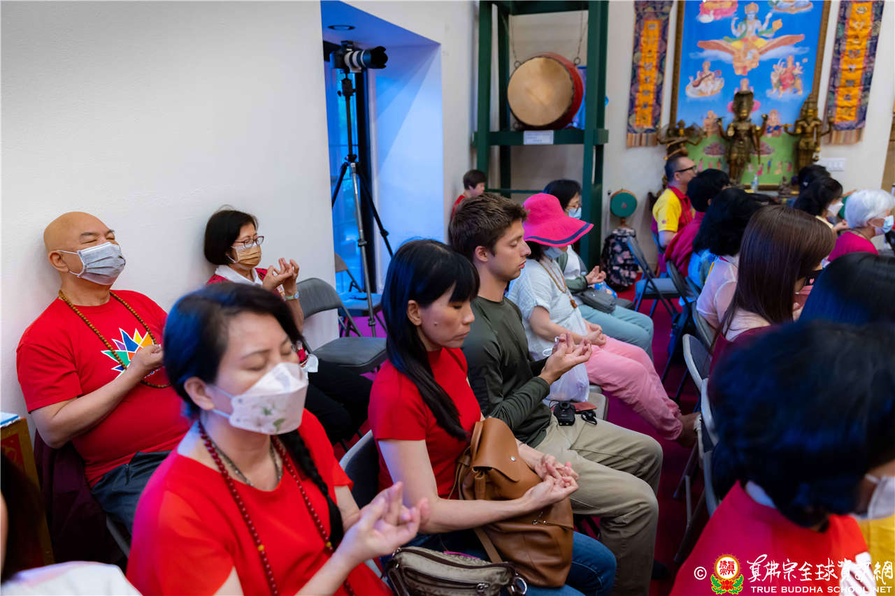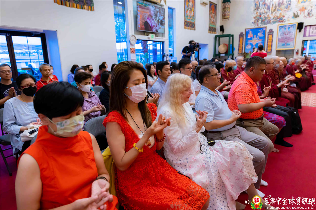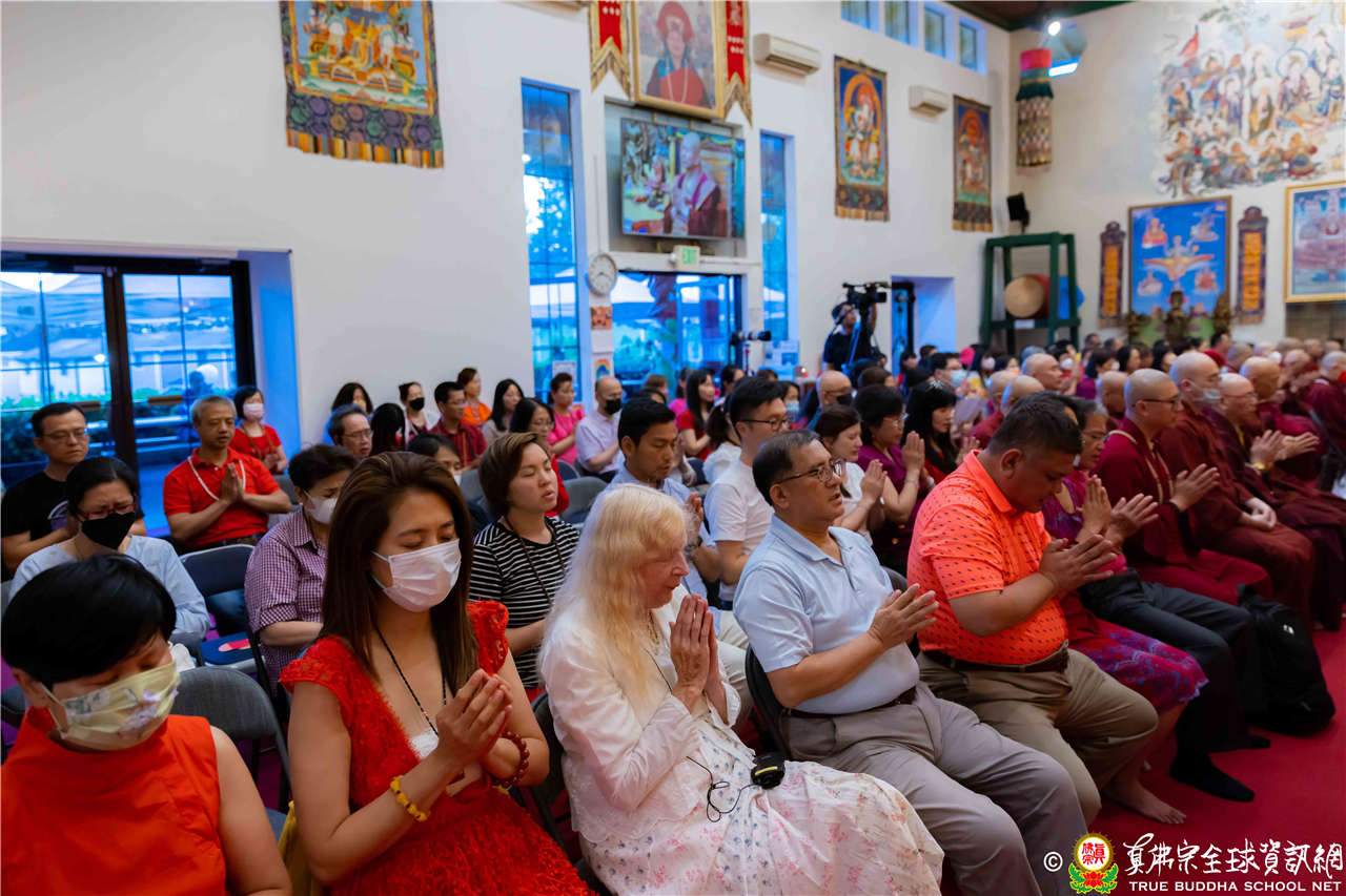 2023年7月22日晚上八時西雅圖雷藏寺大雄寶殿裡人潮匯聚, 來自世界各地及美國各州的四眾弟子,虔誠恭敬的跟隨著聖尊蓮生活佛盧勝彥修持阿彌陀佛本尊法。