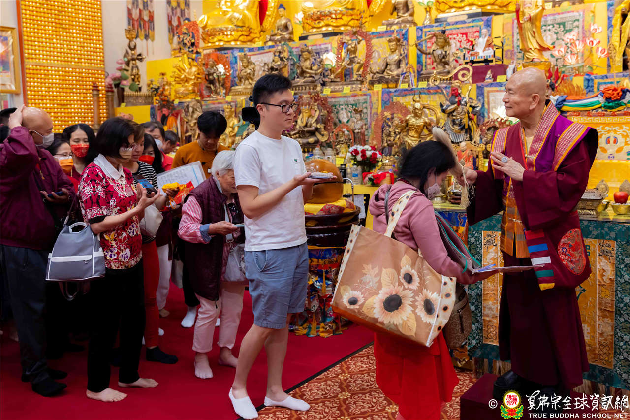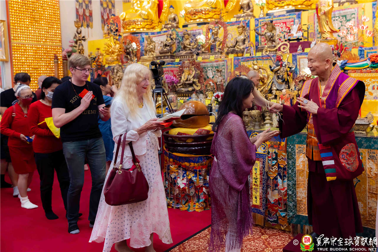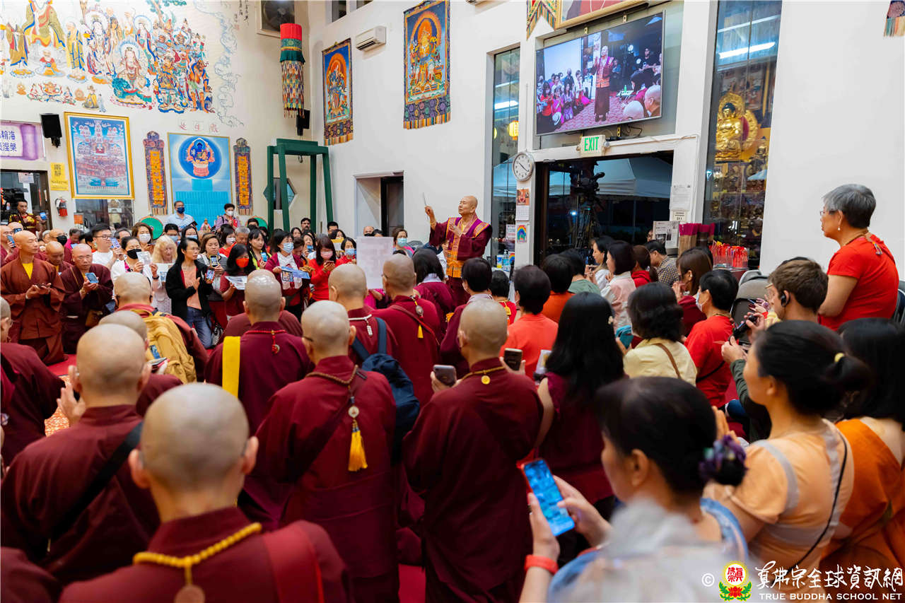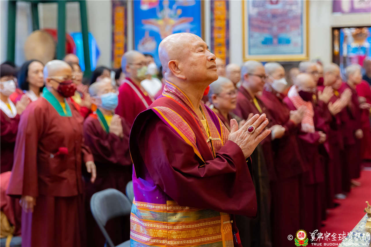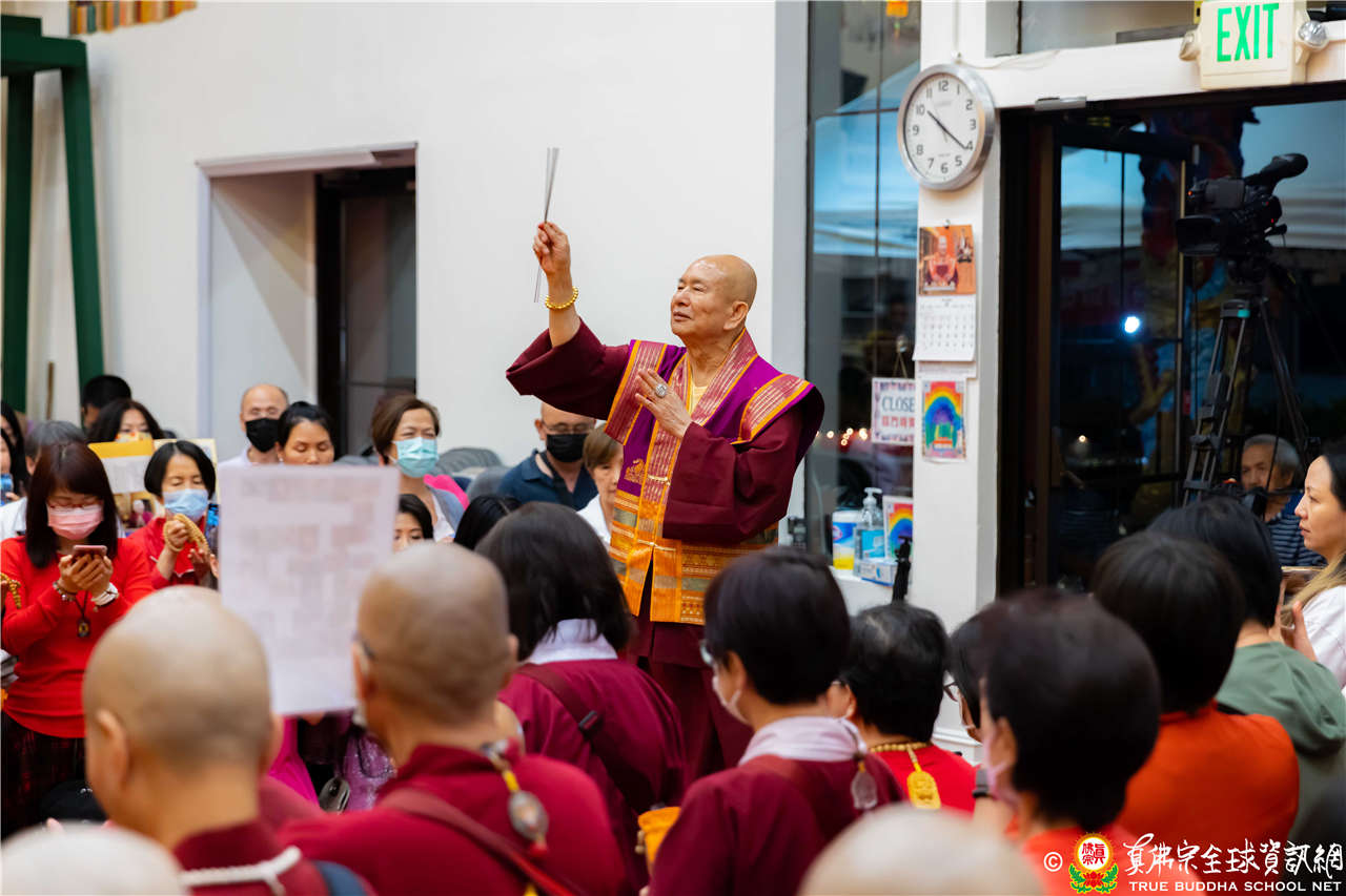 2023年7月22日晚上八時西雅圖雷藏寺大雄寶殿裡人潮匯聚, 來自世界各地及美國各州的四眾弟子,虔誠恭敬的跟隨著聖尊蓮生活佛盧勝彥修持阿彌陀佛本尊法。