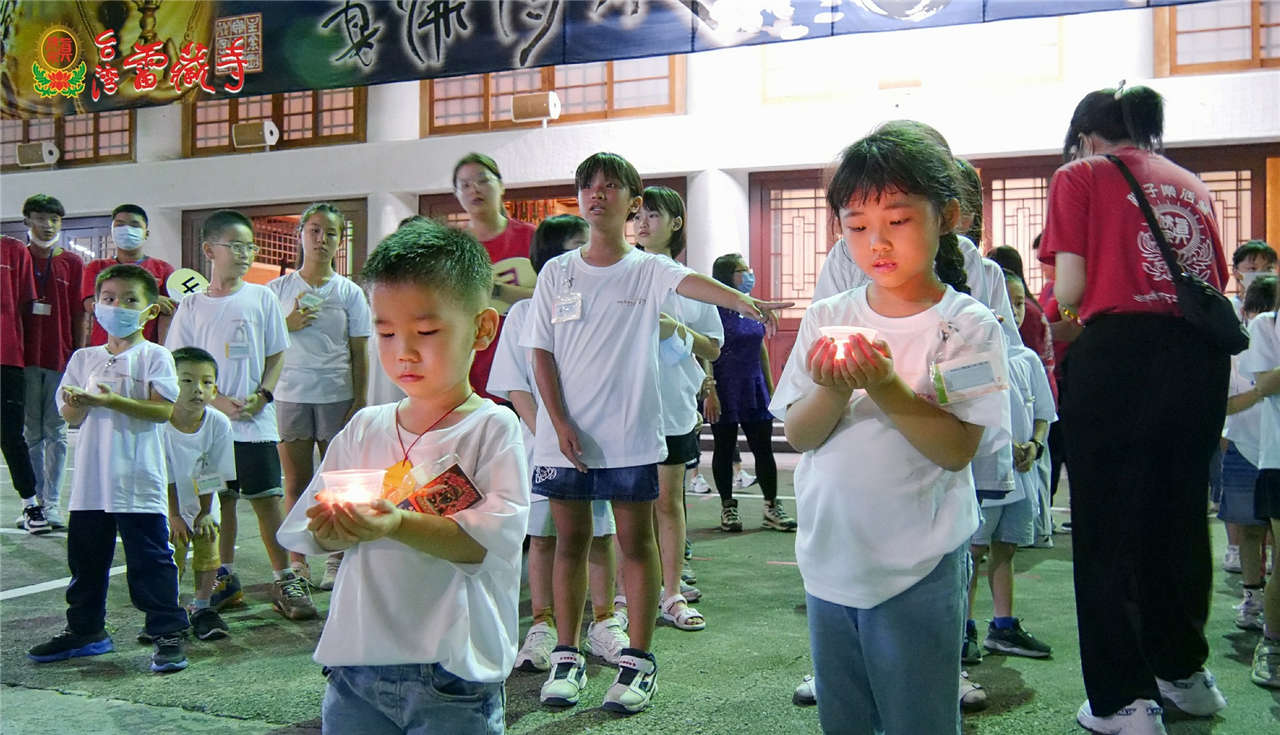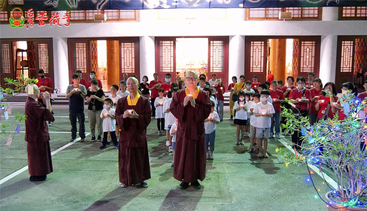 趁著整隊的空檔,蓮津法師為小朋友解釋供燈的殊勝,並說一個小故事來說明繞佛的殊勝功德。大家依次排好隊伍,由密總理事長(蓮東上師)及台灣雷藏寺監院(蓮歐上師)帶領大家,誠心供燈,再一起繞佛,接著再請理事長帶領大家將(供燈)及(繞佛)的功德迴向(請佛住世),為第一天活動做圓滿的結束。