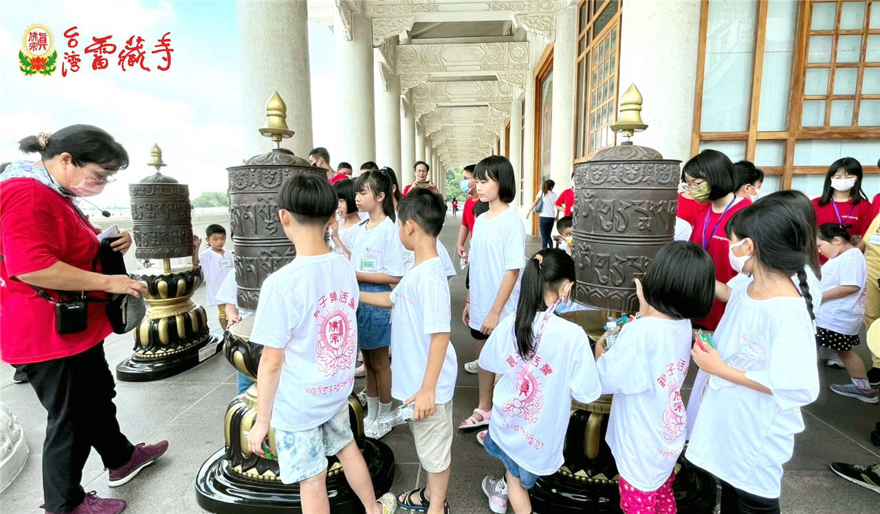 殿外迴廊有著與大殿相對應的大唐卡,還有Q版的花燈小蓮花童子,更有代表密教特色的轉經輪,小朋友依次唸著蓮花童子心咒,轉動經輪..願咒音傳遍十方,為每位小朋友開啓無上善緣。