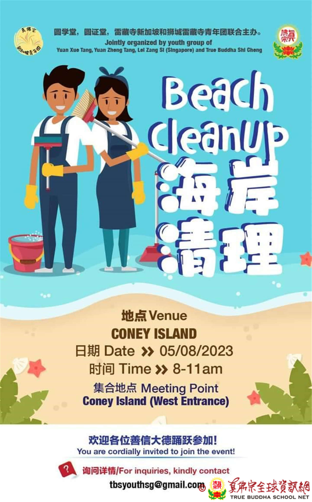 當天大家聚集在科尼島海灘,活動通知中亦有邀請青年團的父母家人朋友一同前來,參與這項有意義的活動。在青年團的號召下,出席者包括教授師、助教、同門及宗外青年約有30位,同心偕手完成海灘清理活動。