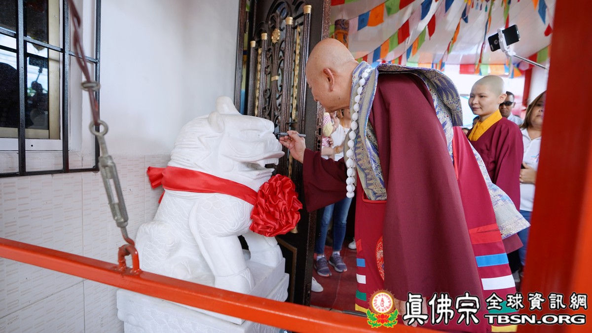 下午約二時許,在鼓樂喧天中,寶華同修會恭請聖尊蓮生活佛剪綵及拉開道場匾額。聖尊還與大家一起放出色彩繽紛的祈願氣球,並在巨幅的法相上簽名留念,並且也為寺門口的獅子點睛加持。開光儀式後,法會的主祈功德主及寶華同修會理事長邱志軍師兄敬獻哈達,以表最崇高的敬意。此次的開幕、開光慶典,特別邀請到巴拿馬的國會議員,大衛區區長等數位尊貴的貴賓蒞臨現場。緊接著,由聖尊主壇帶領與會大眾同修「蓮花童子」本尊法。莊嚴肅穆的同修結束後,在場的全體同門,都報以萬分熱烈的掌聲恭請聖尊首次在寶華同修會法語開示。