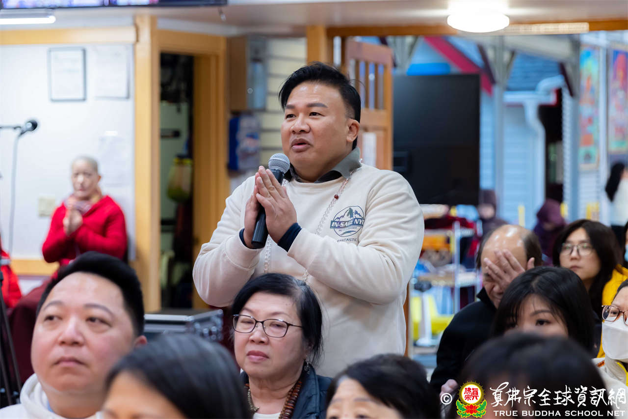 聖尊提起此次來參加法會的同們當中有一位向除蓋障菩薩發願:因為他做一筆生意每次都失敗,最後他求除蓋障菩薩讓他把障礙除掉。發了願以後他這一筆生意就做成了。聖尊請該位同門出來。這位從新加坡來的同門馬上起身,聖尊問他是怎麼跟跟除蓋障菩薩祈求,他陳述自己是9月來西雅圖參加聖觀音菩薩的法會的,當時他有一筆生意已經在進行當中,前兩次差點就成功,就差那麼一點點,他覺得很奇怪,為甚麼稍微有一點點的障礙?在上網時看到11月有除蓋障菩薩法會,除蓋障菩薩是真佛經裡八大菩薩之一、也是高王經裡八大菩薩之一,他一直非常的觸動。於是當時就向除蓋障菩薩許願:「如果讓我這個交易在這段時間之內,這次能成功的話,我就會立刻買機票過來做主祈。」果然在一個星期之內這筆交易就成功了。(眾人鼓掌)