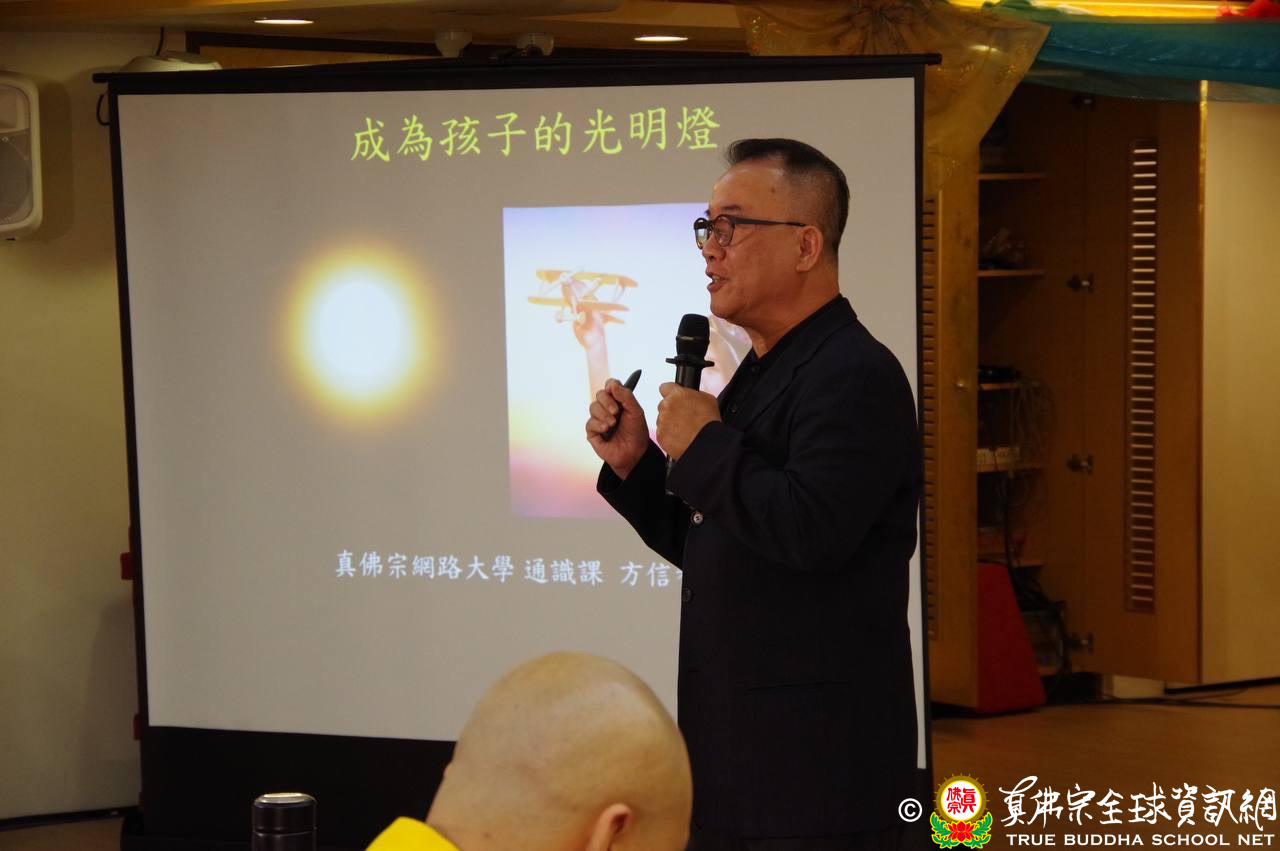 方老師指出「以身作則,身教勝於言教!」孩子不只是聽父母說些什麼?更重要是看父母做了些什麼?父母要成為孩子的光明燈一點都不難,因為,孩子從來都一直亮在那裏,是父母把他給搞暗的、弄壞的,父母只要讓他維持原來的樣子就好。方老師以慈濟小天使夏令營為例,把孩子當小紳士、小淑女,孩子就會表現出紳士、淑女的樣子。當父母、老師的態度改變,孩子人生也會跟著改變。別人從來不會因為你的批評而改變,卻會因為我們的用心付出而變得不一樣。