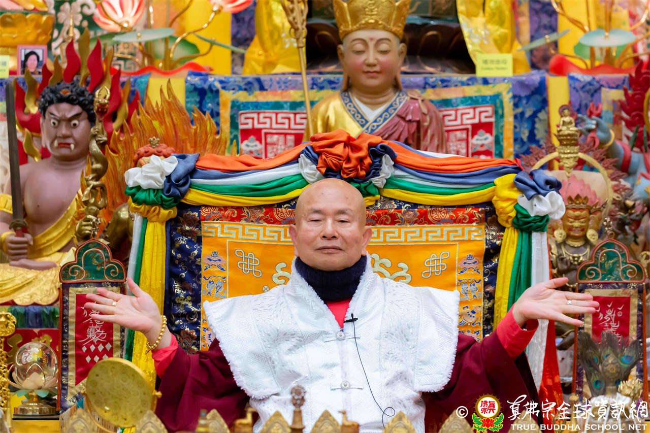 聖尊精彩寶貴的法語開示後,慈悲為新皈依弟子做皈依灌頂,並加持大悲咒水、開光佛像,及持拂塵加持與會眾等。