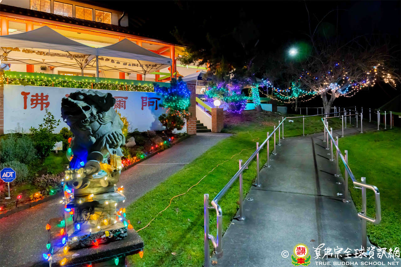 2023年12月2日晚上八時,美國西雅圖雷藏寺舉行觀世音菩薩本尊法同修,恭請根本上師蓮生活佛盧勝彥主持。雷藏寺為了迎接即將到來的聖誕節,精心裝飾,好一片絢麗的光之秀。每一盞燈飾都宛如璀璨的寶石,懸掛在樹枝間,閃耀著柔和的光芒,整座寺廟呈現著歡樂氛圍。