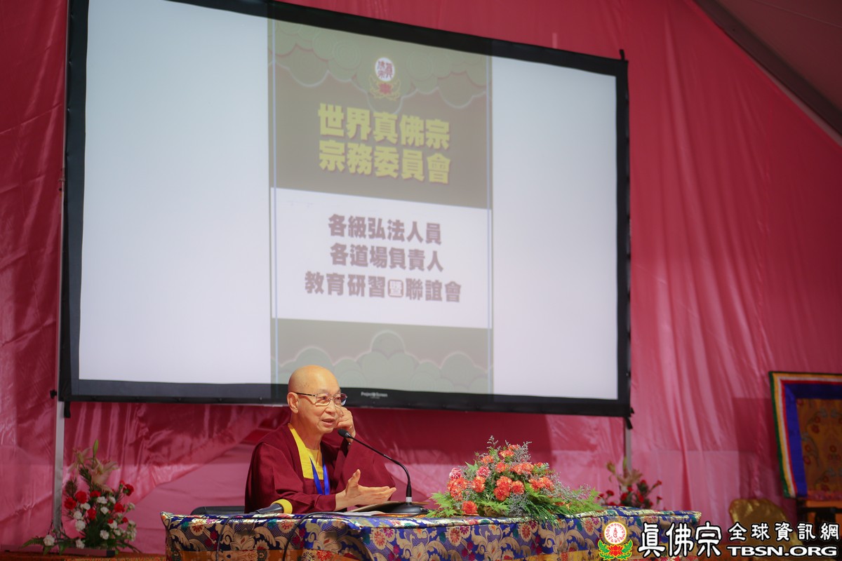 誦戒完畢後,接著由宗委會會長蓮花程祖上師做開場致詞,望與會者皆能以戒為師,謹守本份與禮儀,能夠了知法也能依法修持者,方為法師。上師也再提醒眾人,出家是離開世俗的家,但世俗的事還是要做,可是心必須要超越世俗;因為行止符合出家戒,光明自然就會顯現。致詞完畢後,主辦單位播放師尊對弟子法語開示的短片;短片映畢,研習講座正式啟動,首先由長老常智上師為與會人員們開示「威儀」。