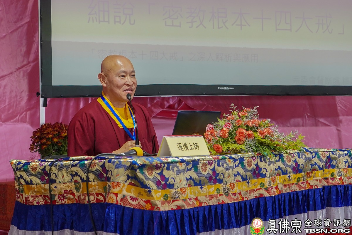 爾後,蓮僧上師繼續為大眾細說「密教根本十四大戒與實際個案研究」。首先,上師先以輕鬆的幽默感開示,若要將心境完全清淨不犯戒,大概就已經成就了。並鼓勵大眾,當想法和行為與戒律相悖時,當下就要能立斷、反省與懺悔。
