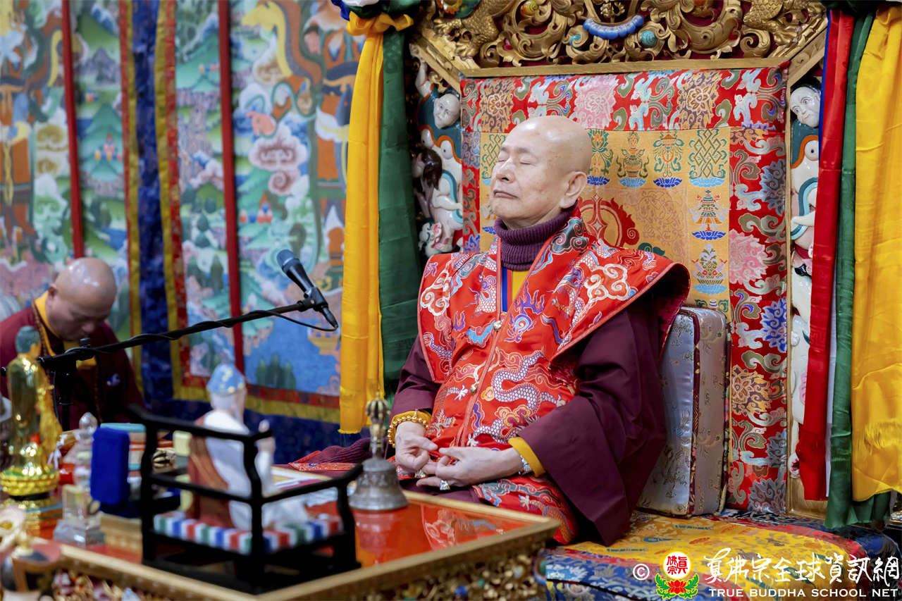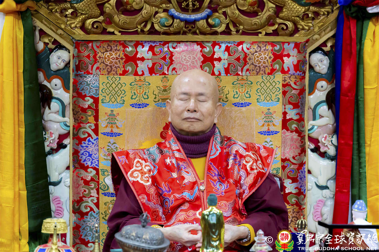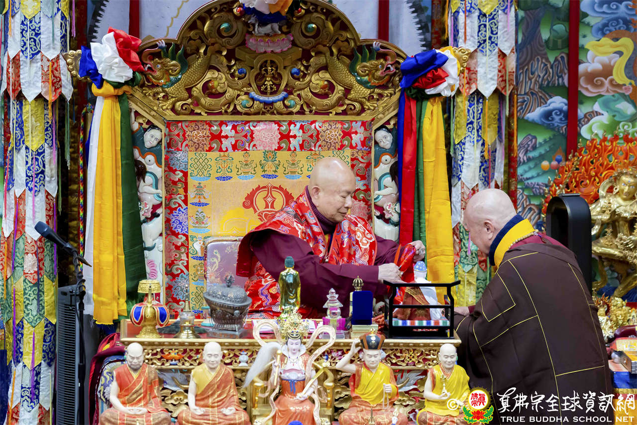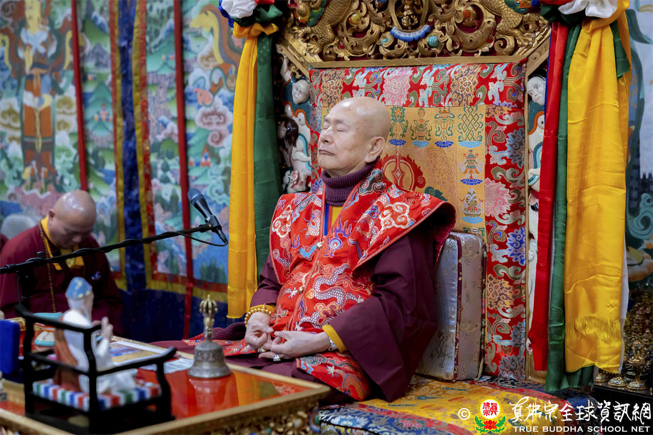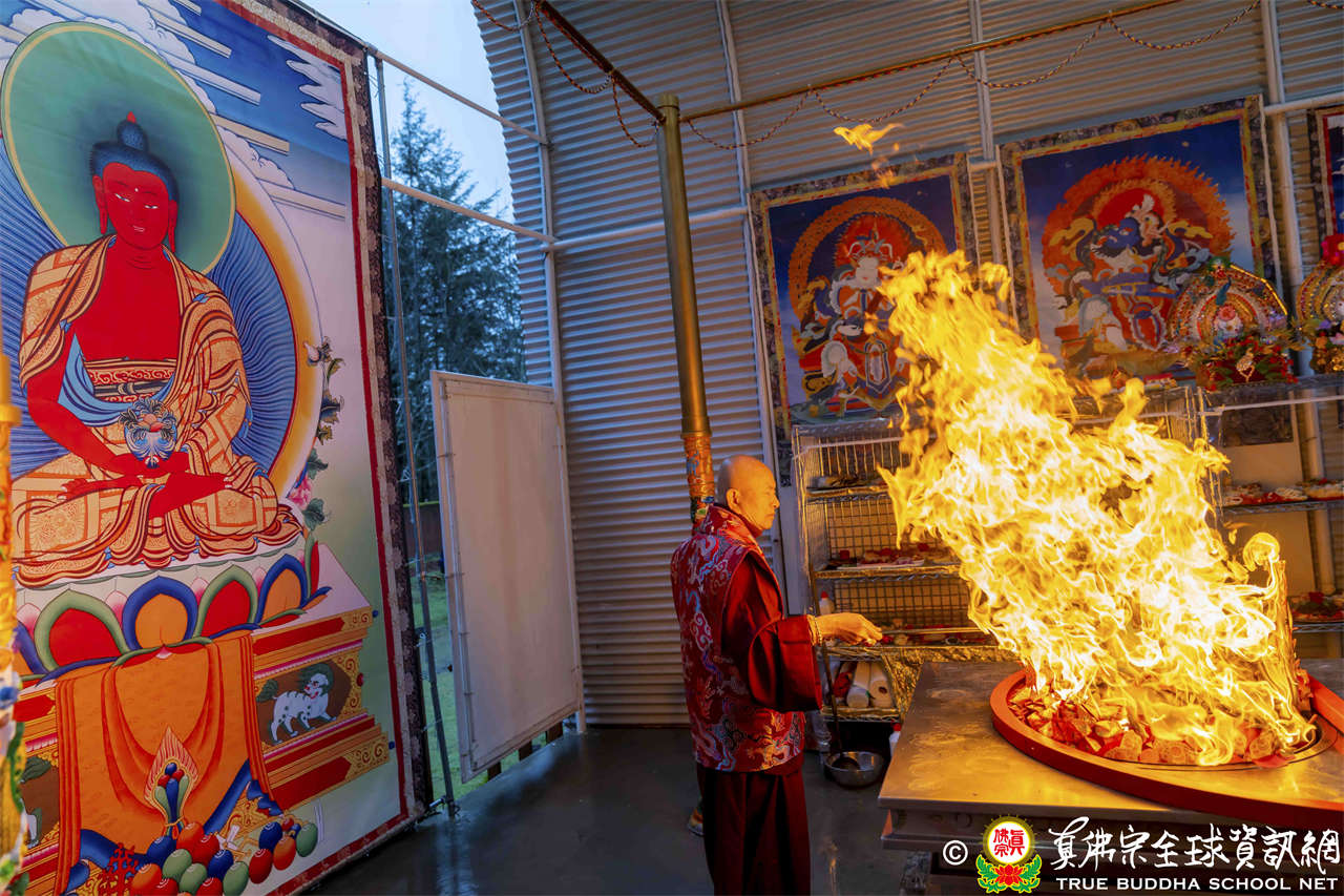 法王開示至此,護摩法會圓滿結束。接著,法王與線上的弟子打招呼,並爲現場出席者賜授阿彌陀佛法灌頂。