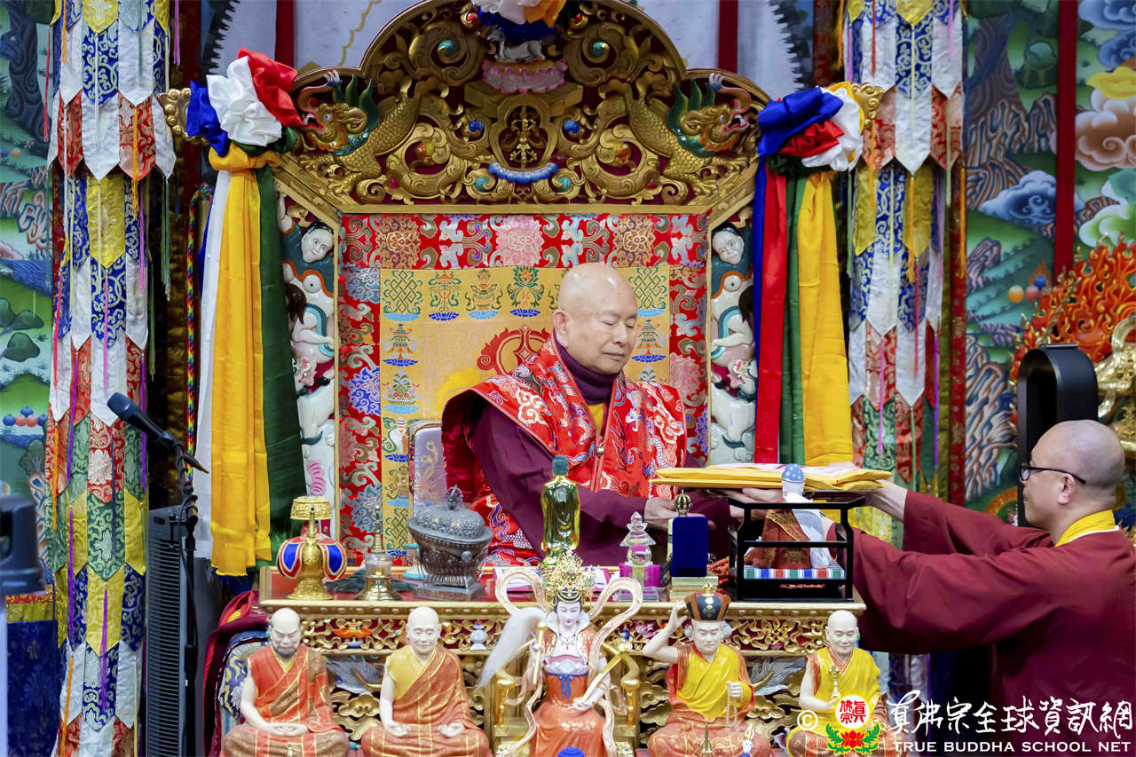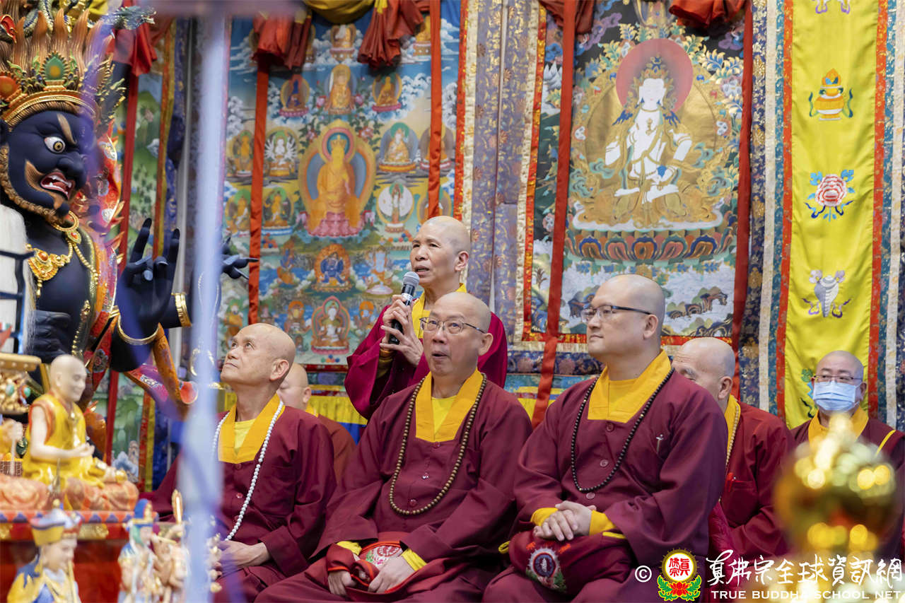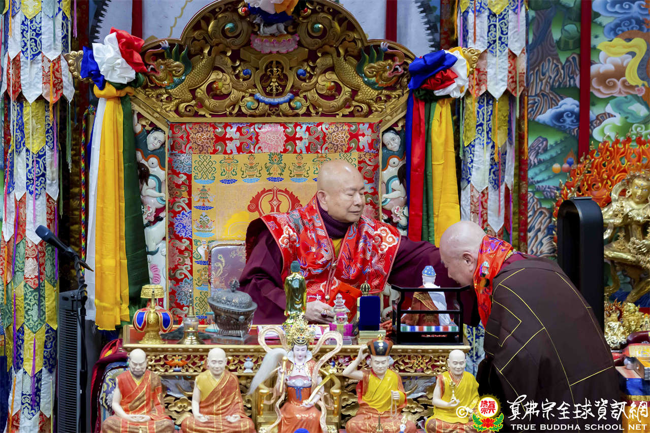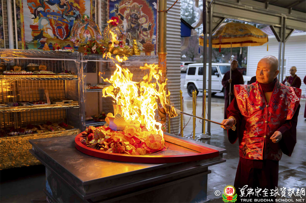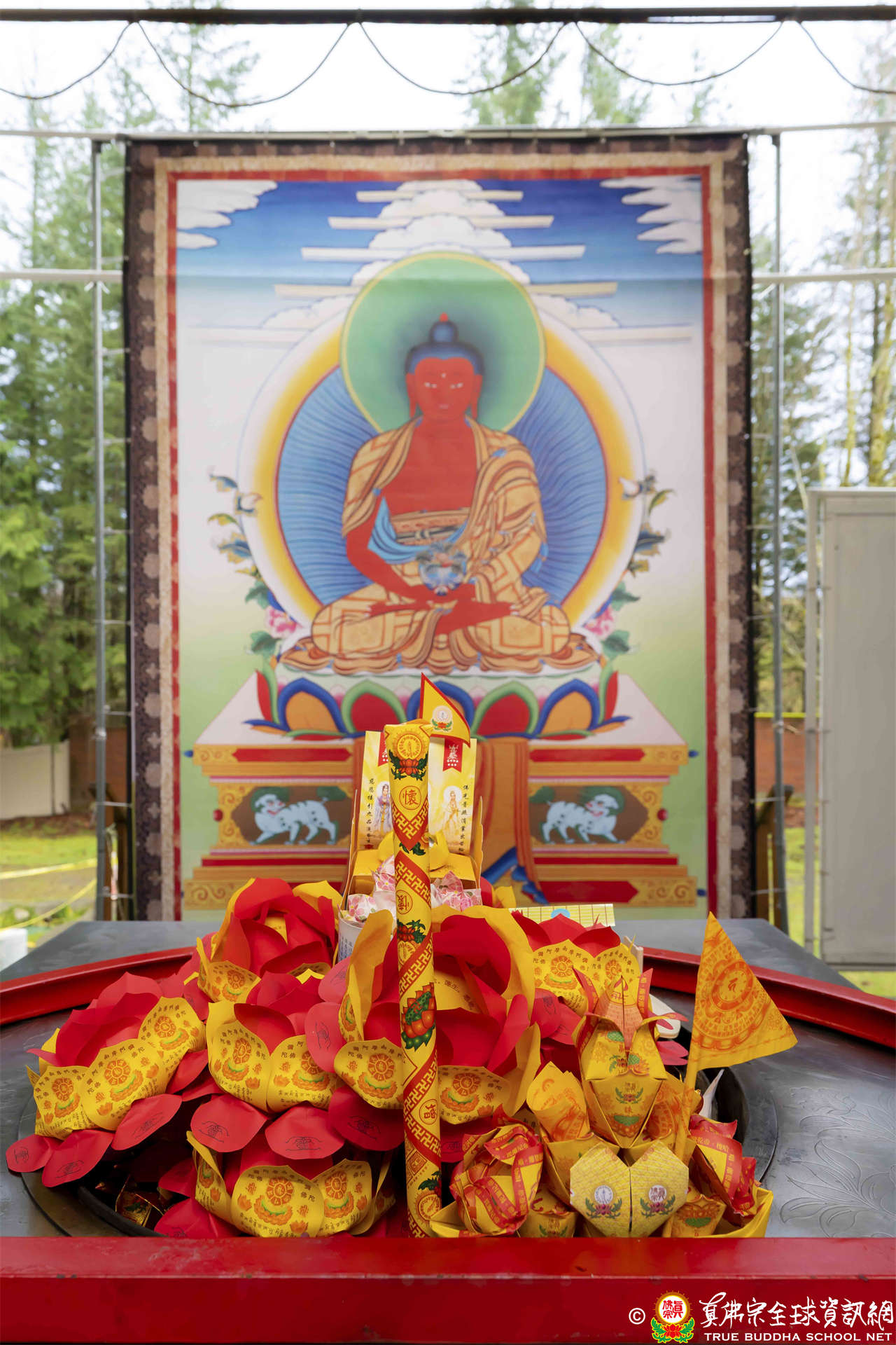 法王開示至此,護摩法會圓滿結束。接著,法王與線上的弟子打招呼,並爲現場出席者賜授阿彌陀佛法灌頂。