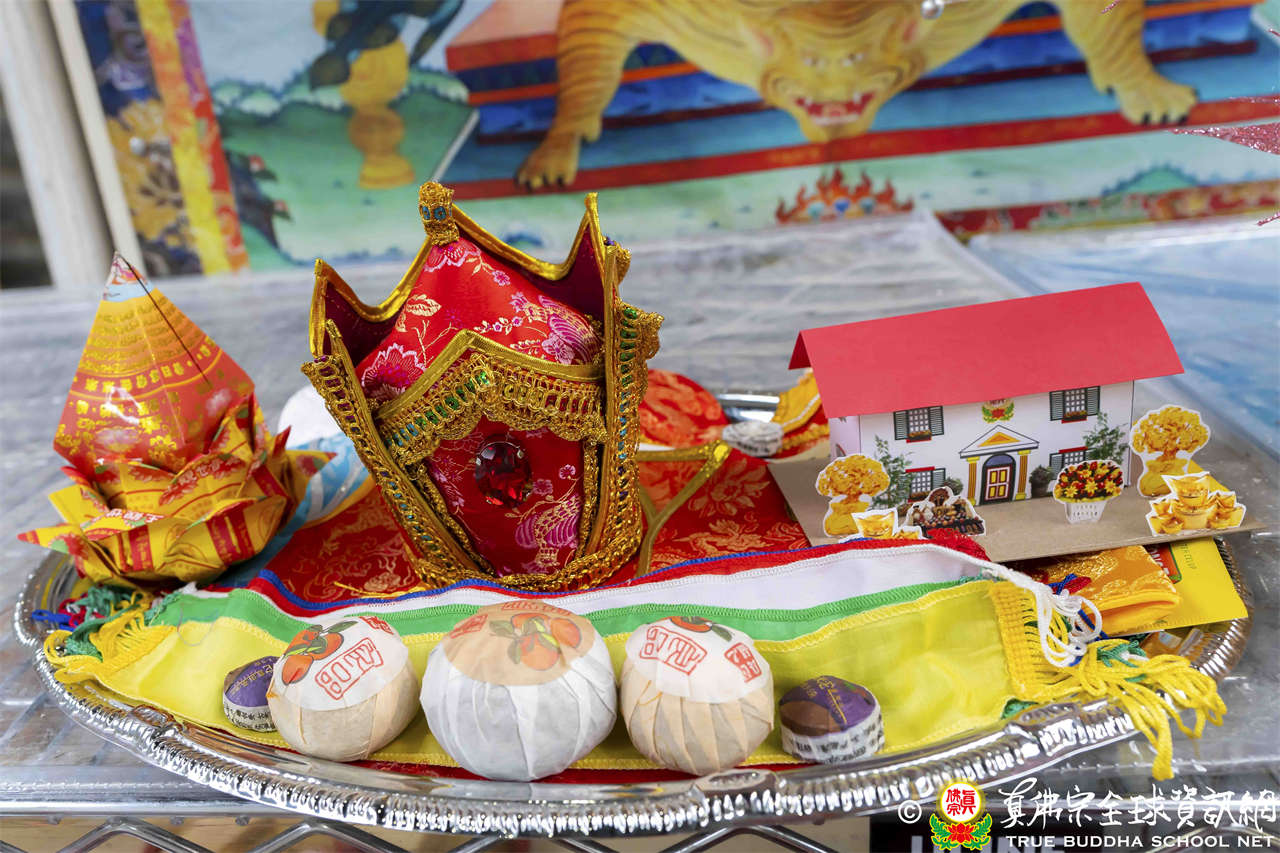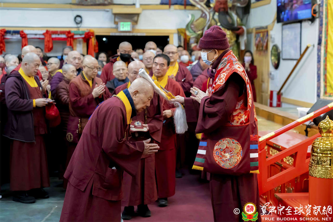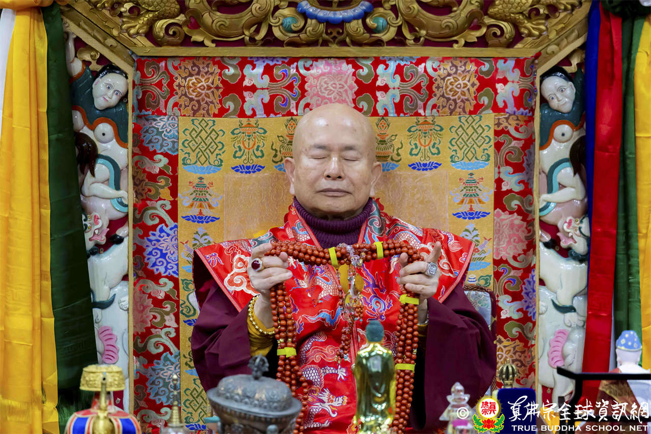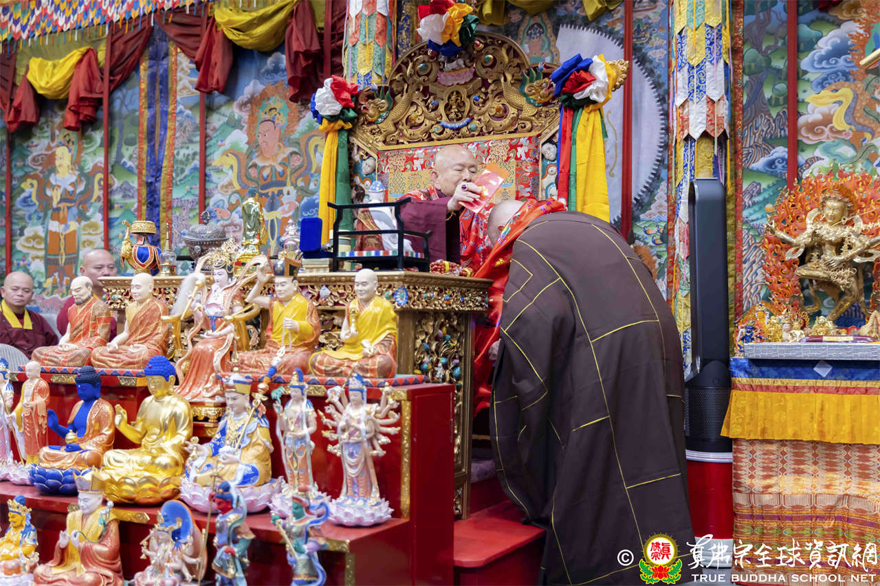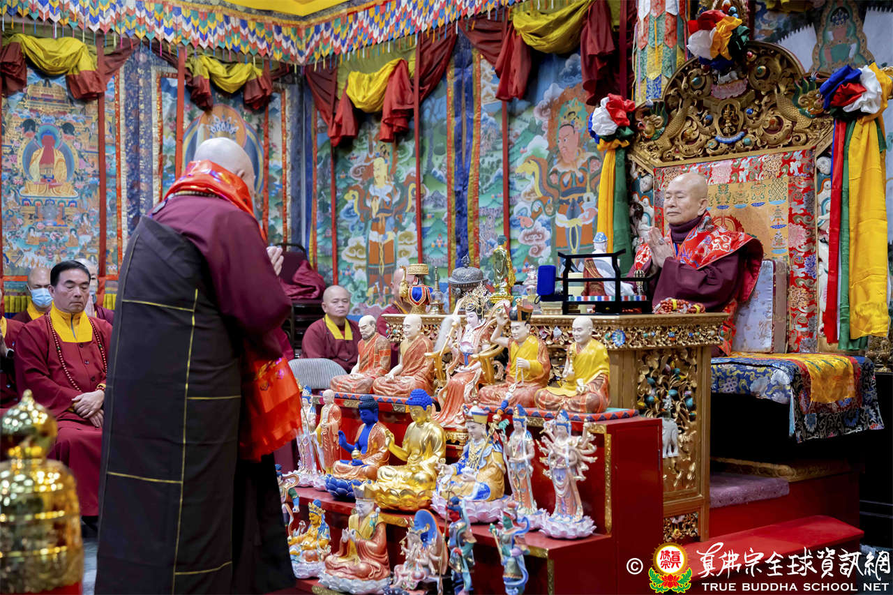 法王開示至此,護摩法會圓滿結束。接著,法王與線上的弟子打招呼,並爲現場出席者賜授阿彌陀佛法灌頂。