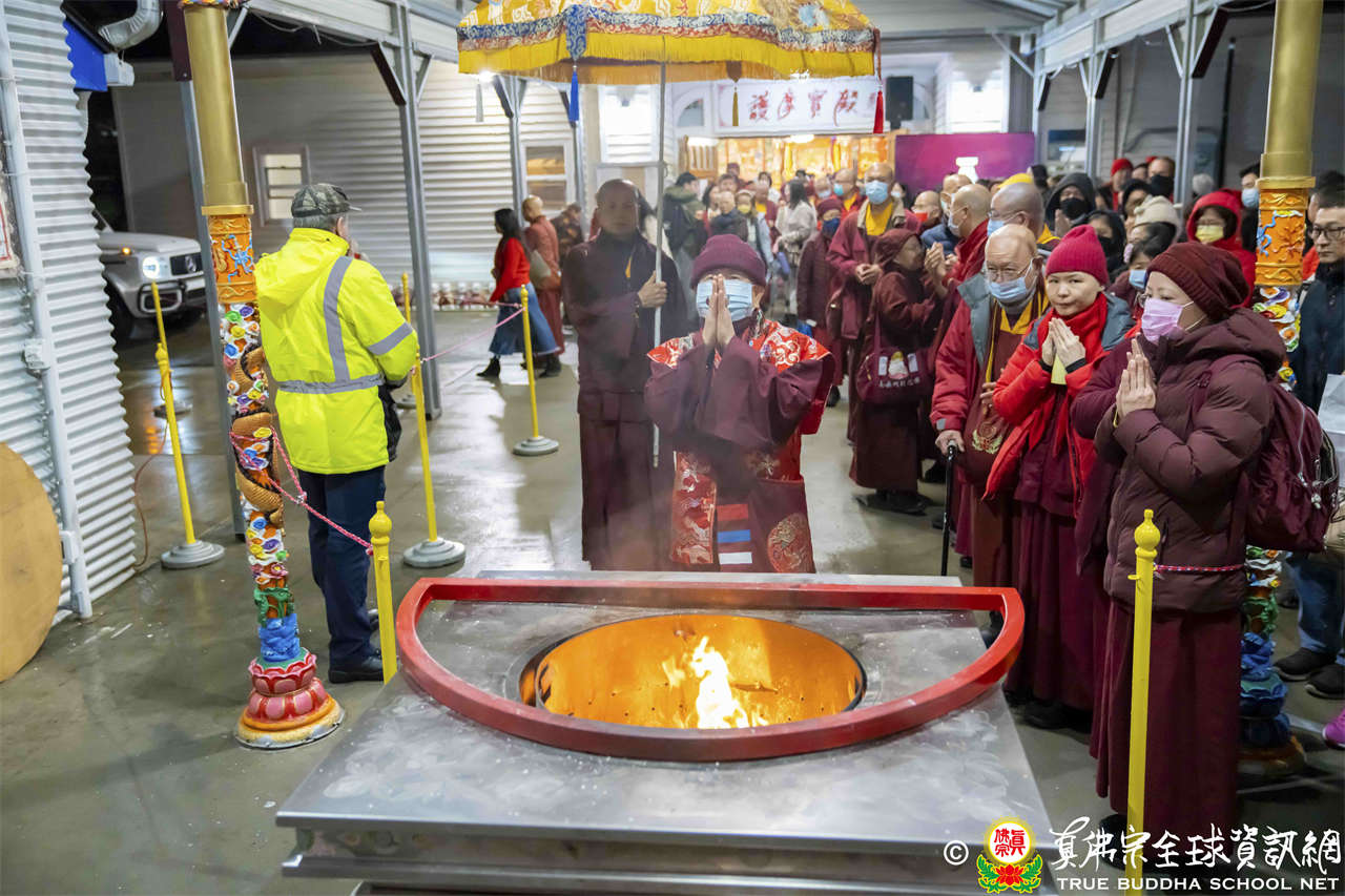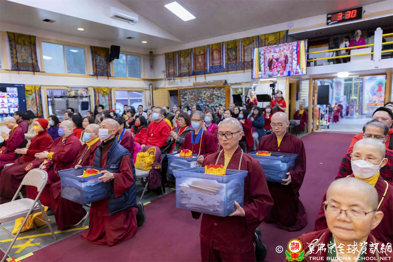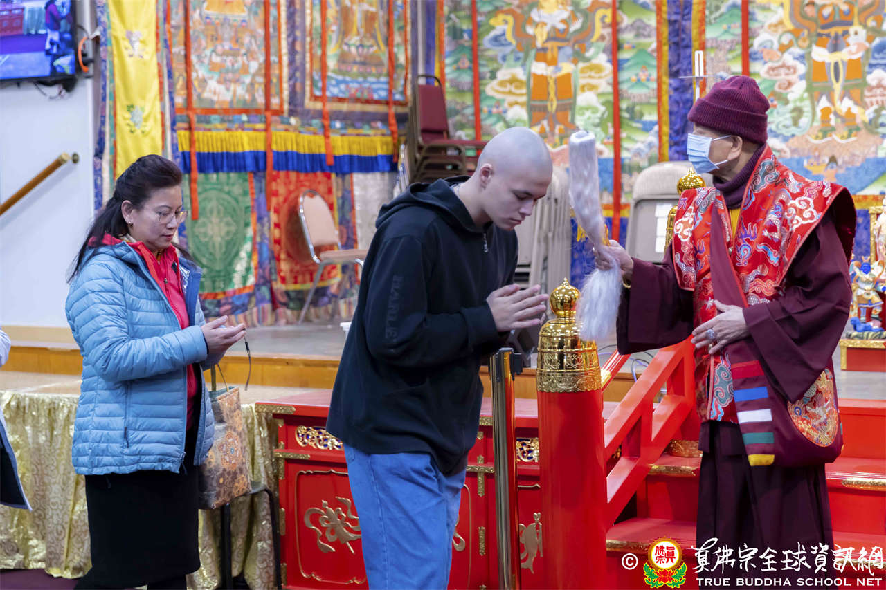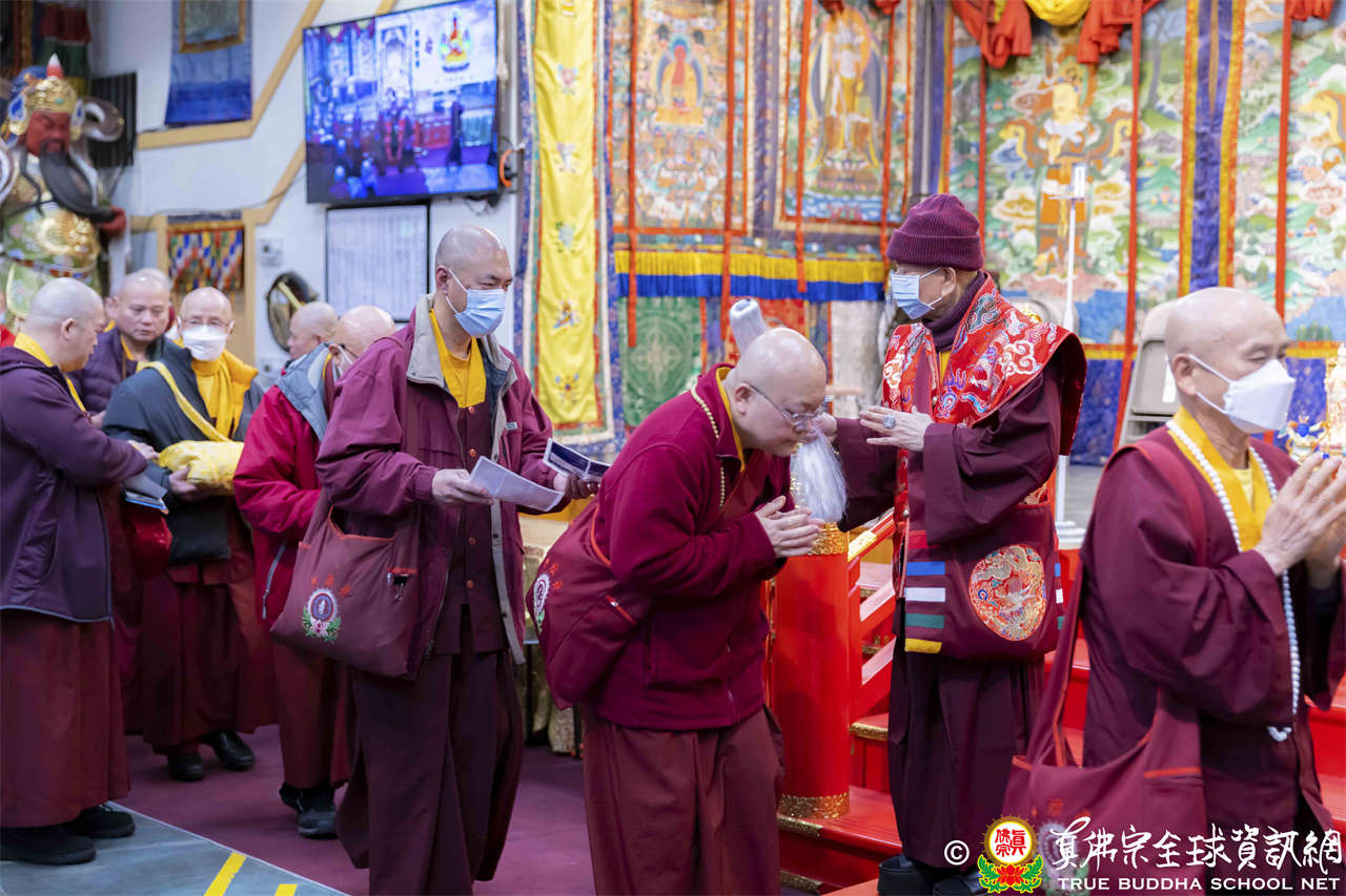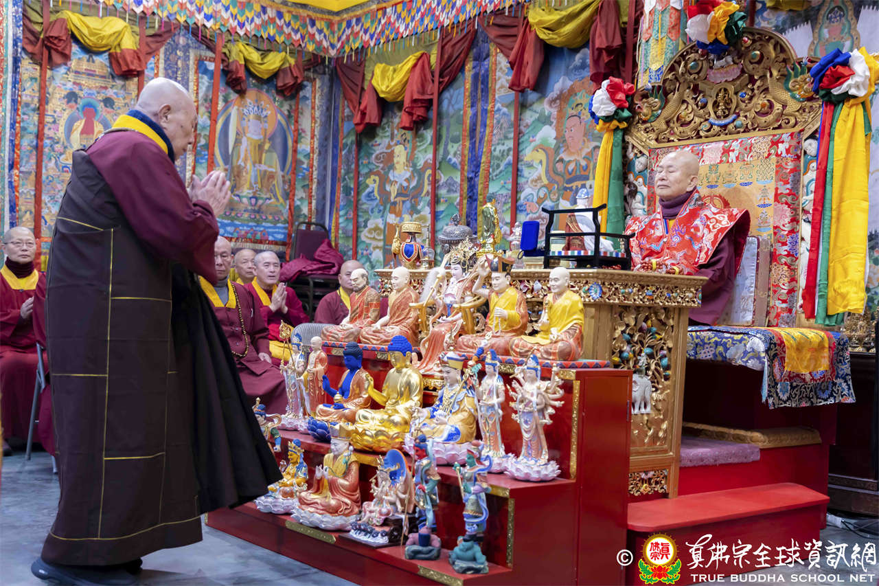 法王開示至此,護摩法會圓滿結束。接著,法王與線上的弟子打招呼,並爲現場出席者賜授阿彌陀佛法灌頂。