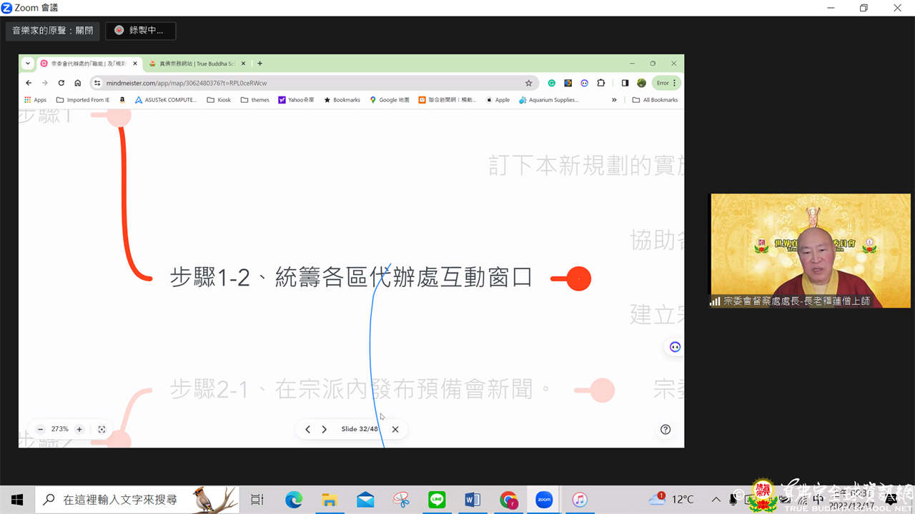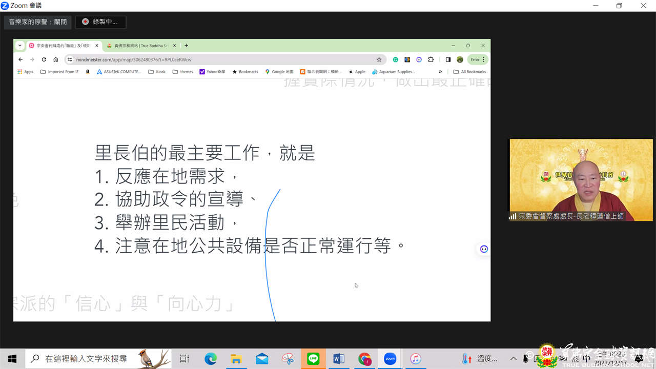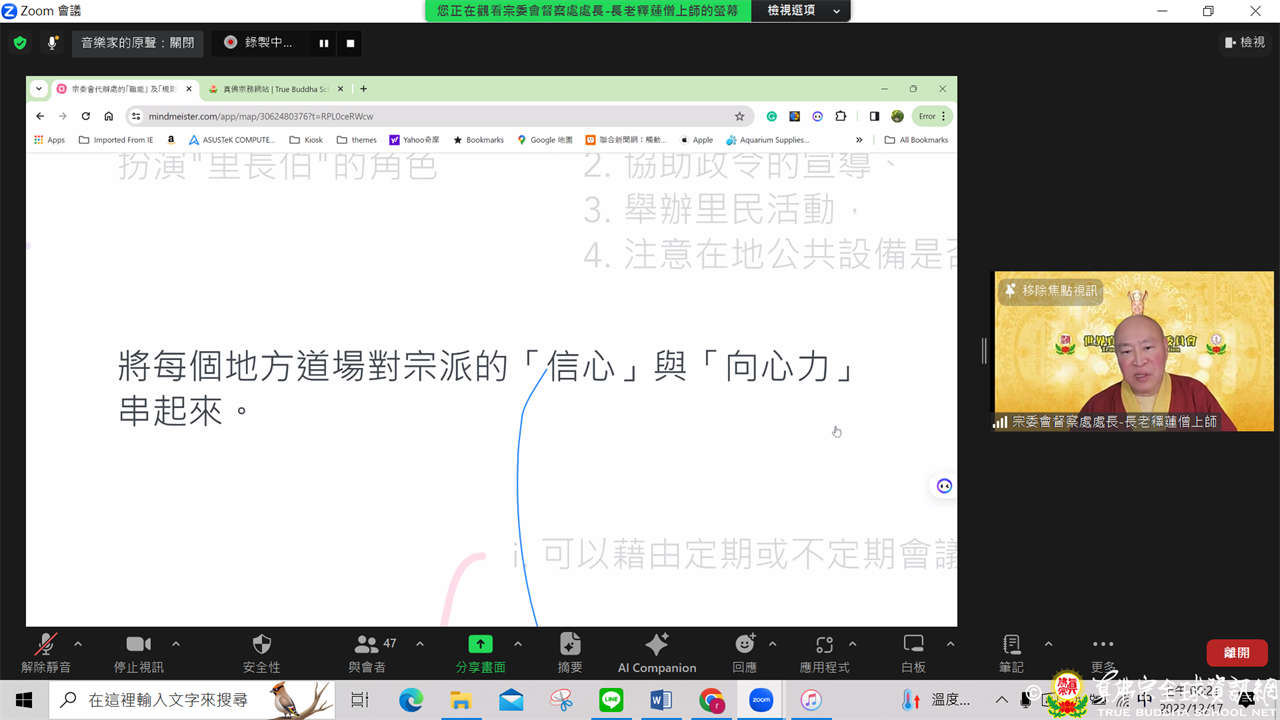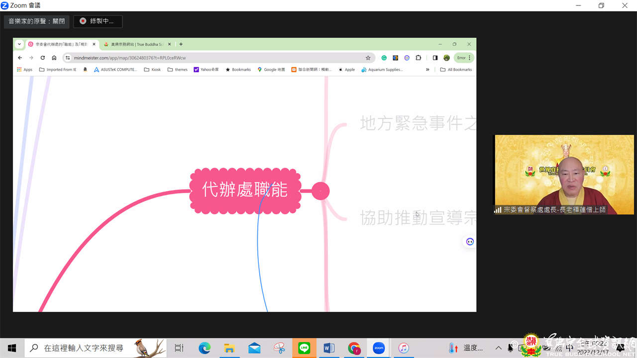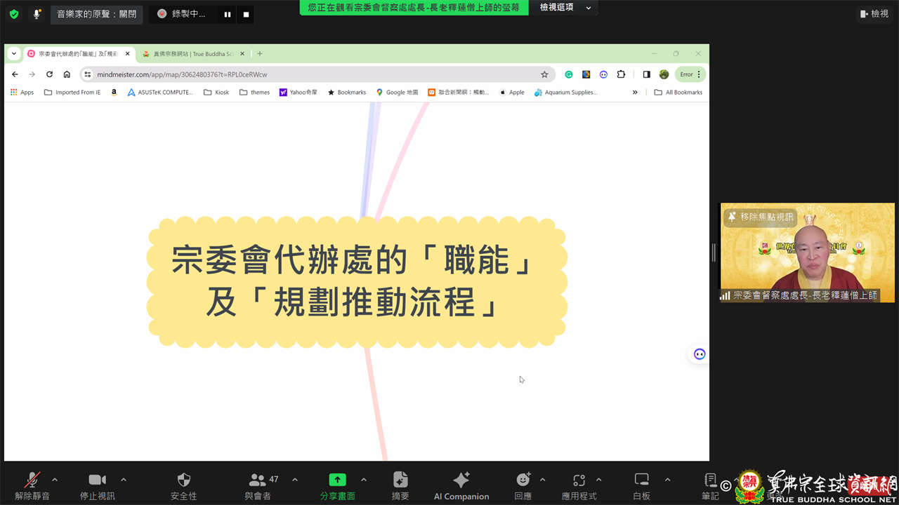 接著由釋蓮僧上師向各代辦處說明:宗委會代辦處的「職能」及「規劃推動流程」,分為四大部分做講解: