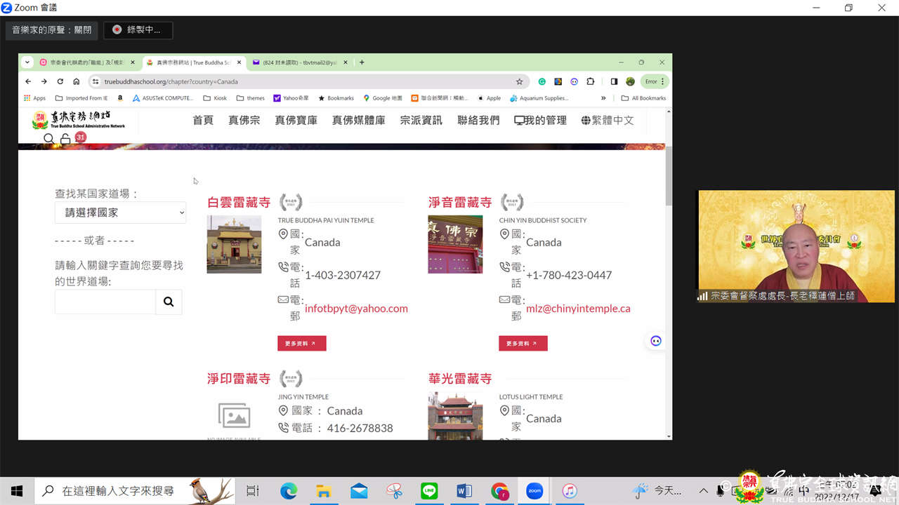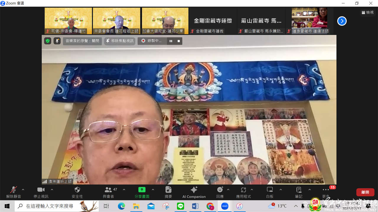 世界真佛宗宗務委員會核心小組與美國、加拿大及大洋洲真佛宗宗委會代辦處共有51位成員,於西雅圖時間2023年12月16日,於ZOOM線上召開首次交流會。本次交流會,主要由督察處處長長老釋蓮僧上師說明宗委會代辦處的功能及責任,以及與各地代辦處互動交流,氣氛溫馨討論熱烈。