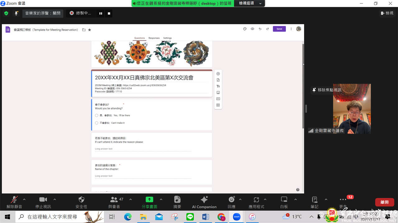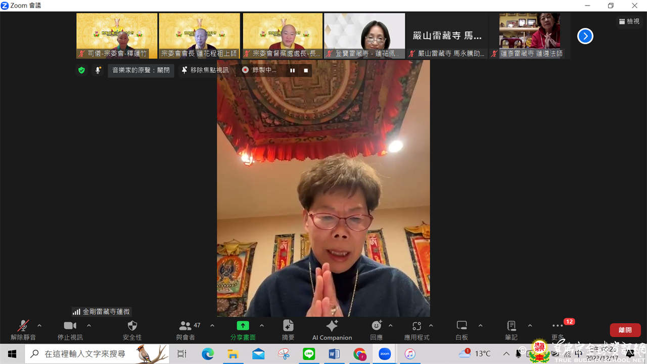 首先是美國代辦處代表蓮者上師發言,接著金剛雷藏寺堂主蓮微師姐也說明本次聯繫美國各道場的情形,查詢宗務網上的道場資料,很多道場都是空白的,蓮者上師也提到在美國區道場登入宗務網方面,釋蓮䁎法師可以提供此方面的協助,金剛雷藏寺的道場資訊法務報備等,都是由釋蓮䁎法師來完成,目前金剛雷藏寺的積分已經達標了。美國區道場出席有1.尊勝雷藏寺。2.金剛雷藏寺。3.登寶雷藏寺。4.薩迦雷藏寺。5.一如雷藏寺。6.密儀雷藏寺。7.三輪雷藏寺。8.禪觀雷藏寺。9.聖德雷藏寺。10.觀照雷藏寺。11.波特蘭同修會。12.財神堂。