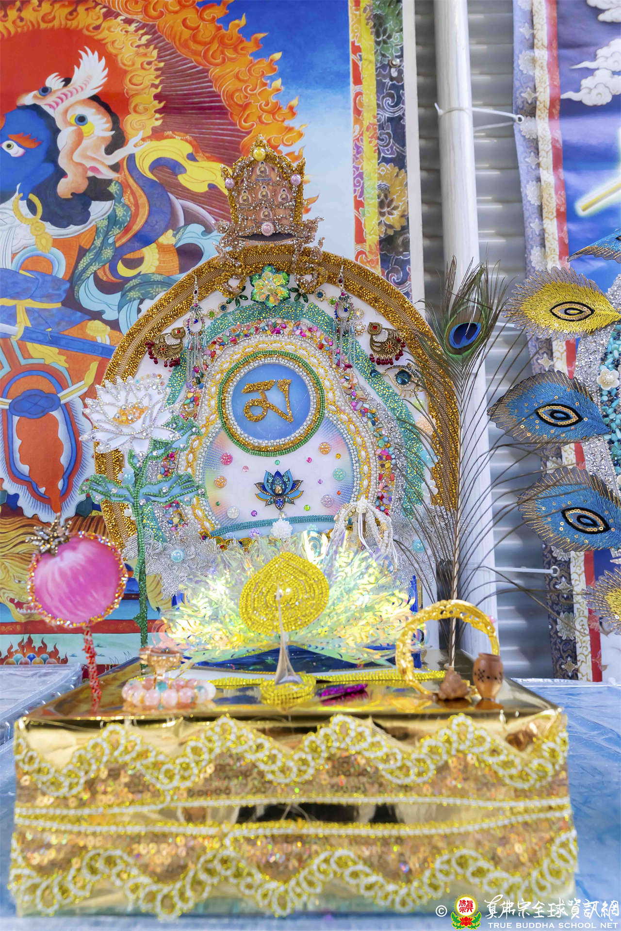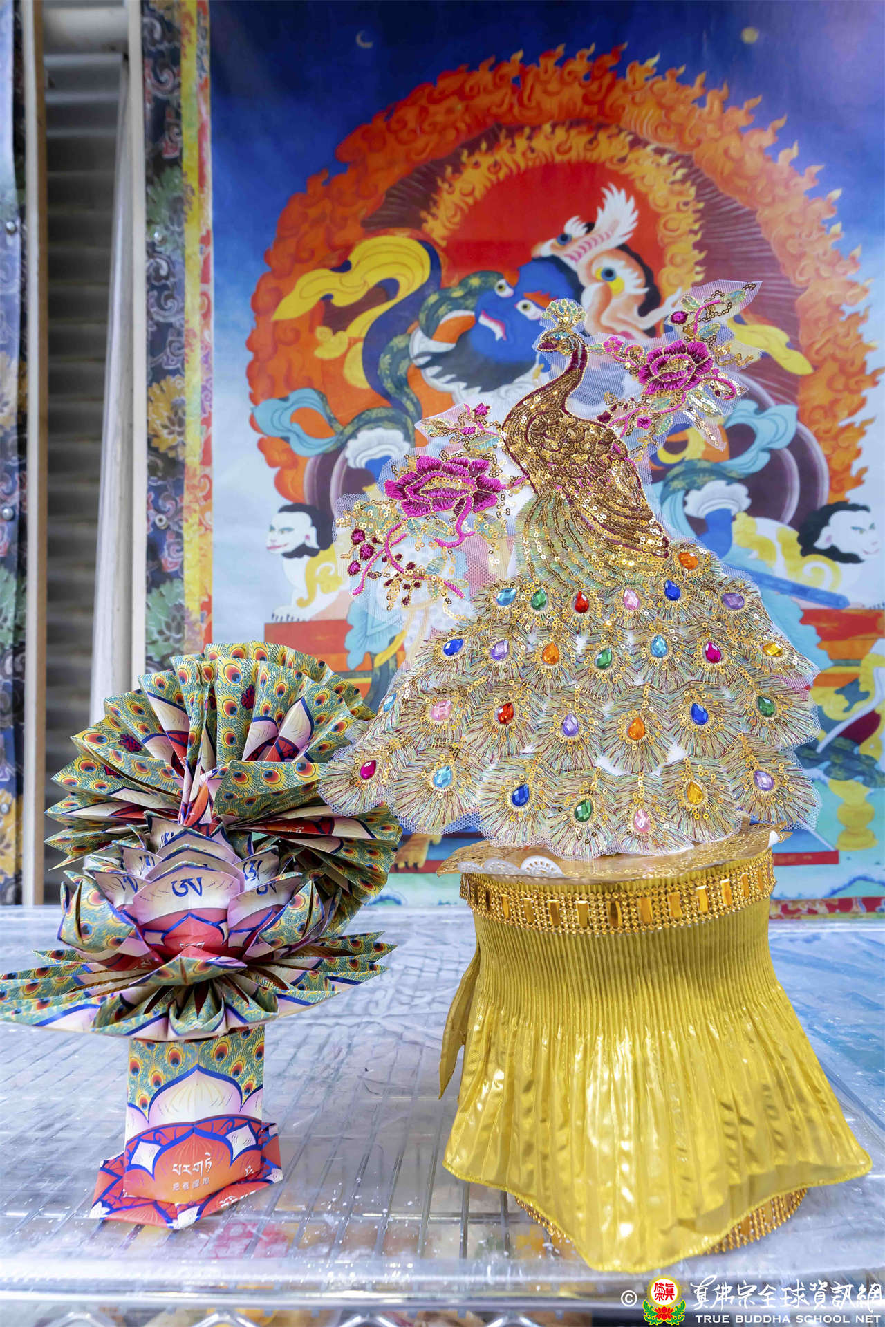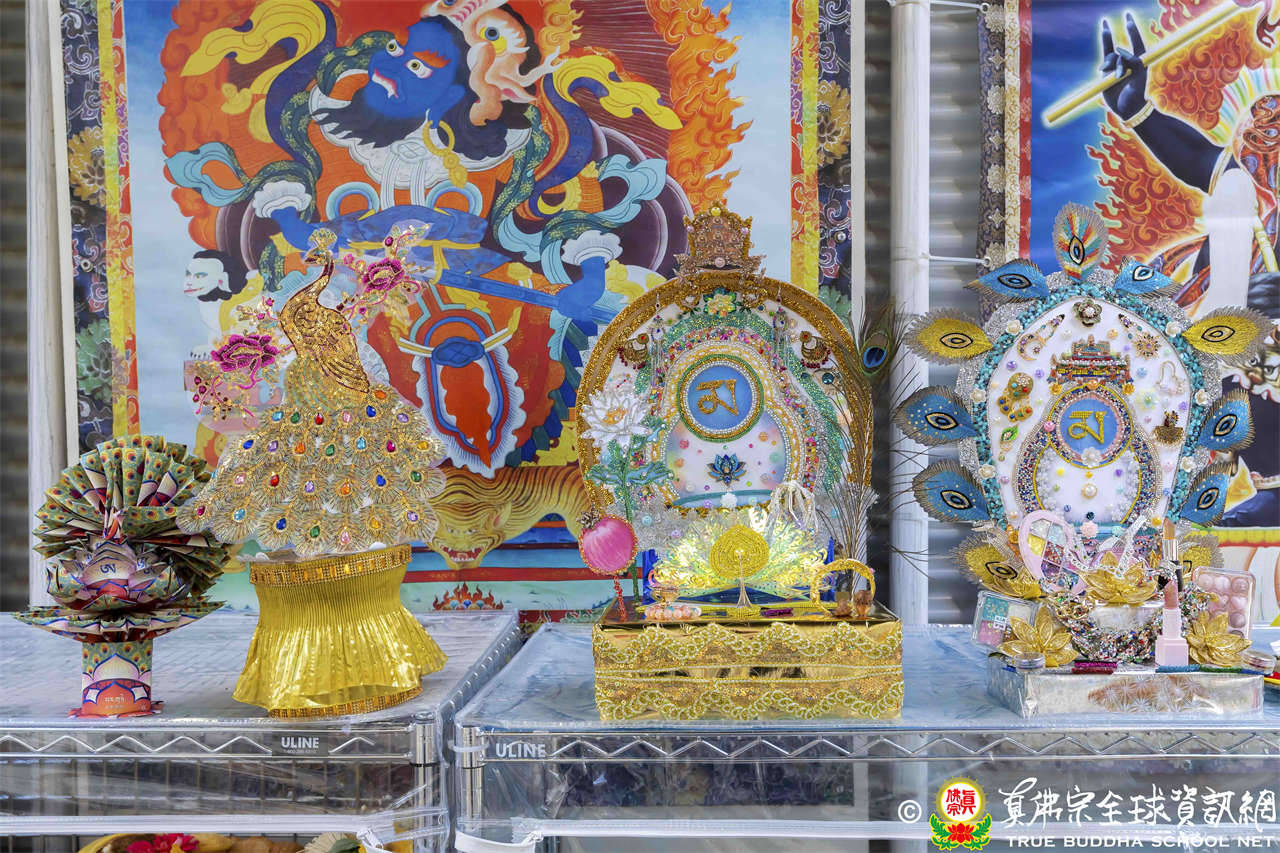 今日是「孔雀明王」護摩法會,「孔雀明王」頭戴大日如來寶冠,釋迦牟尼佛在過去世中曾經當過孔雀王,西方極樂世界中,阿彌陀佛變化出孔雀、鸚鵡、迦陵頻伽共命之鳥,孔雀明王也是阿彌陀佛的變化身,所以祂等同三個如來的變化身。祂有四臂,分別握有孔雀羽(降伏)、白蓮花(息災)、吉祥果(增益)與具緣果(敬愛),可作「息、增、懷、誅」等羯摩法,威力強大。孔雀明王的眷屬非常之多,真佛宗有很多空行母,其中最主要最大的空行母,就是代表智慧的般若佛母。修行要有智慧,修行相應到空行母,要心存恭敬。西藏第一佛母伊喜措嘉在釋迦牟尼佛時代是恆河女神,其他變化身如常啼菩薩、金剛瑜伽母、妙音天女、白度母、瑪吉拉尊、雪山女神……等,都是非常重要的佛母、空行或天女。