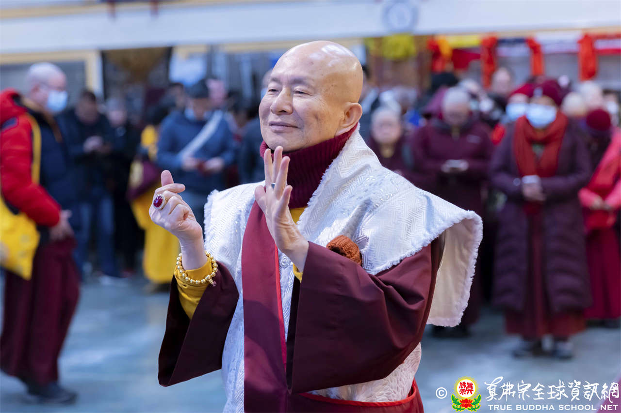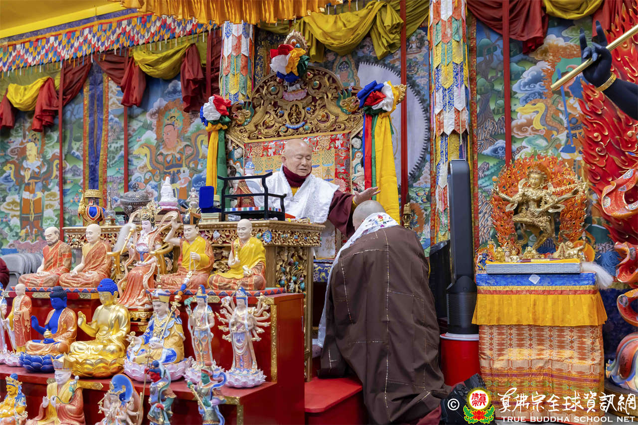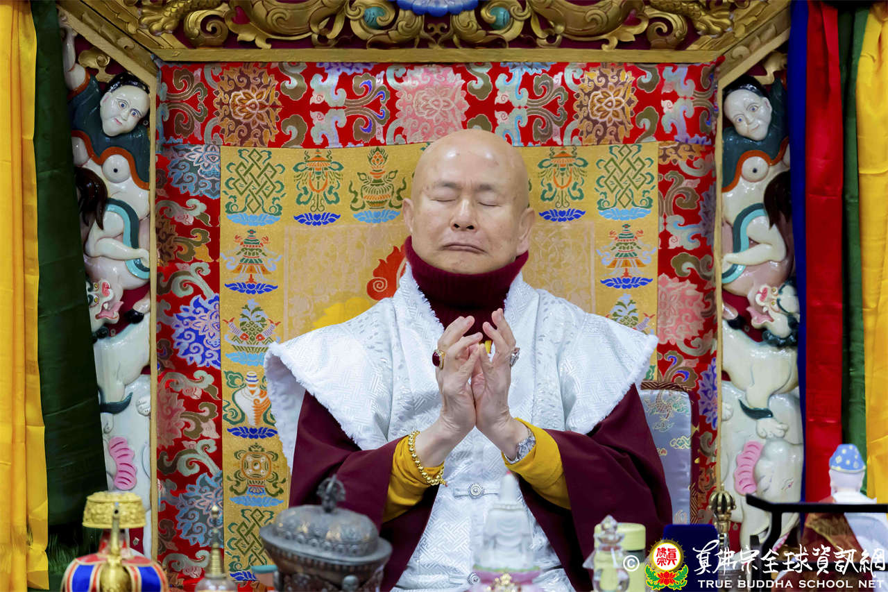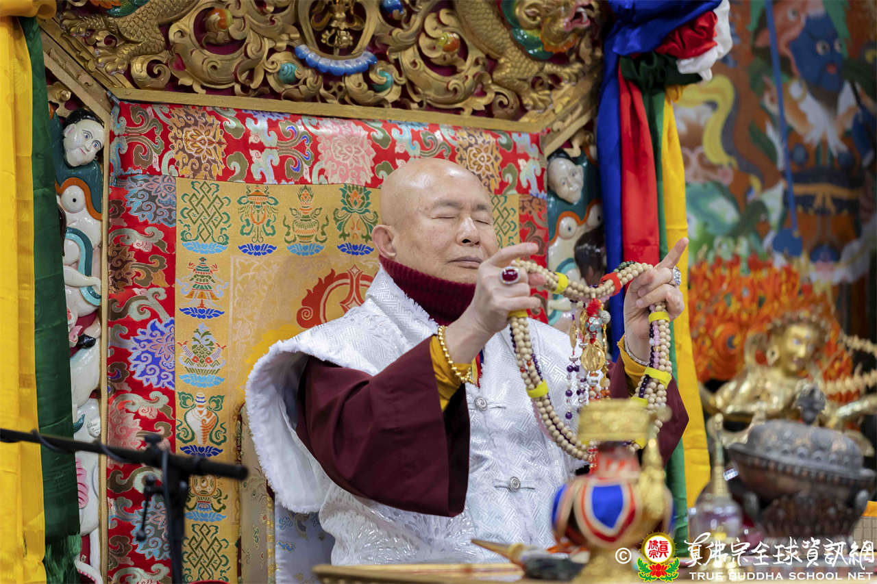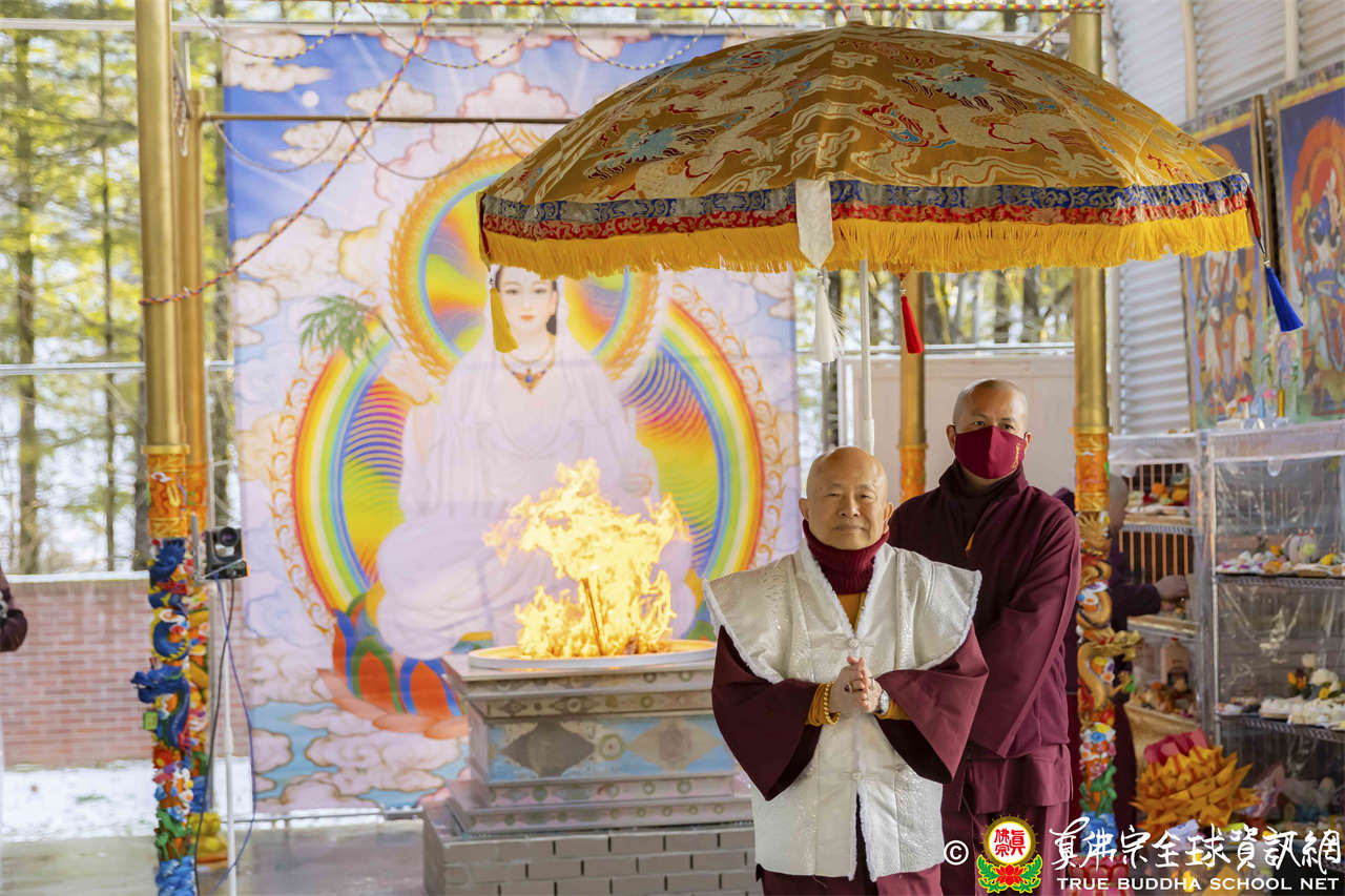 法王開示至此,護摩法會圓滿結束。接著,法王與線上的弟子打招呼,並爲現場出席者賜授觀世音菩薩法灌頂。