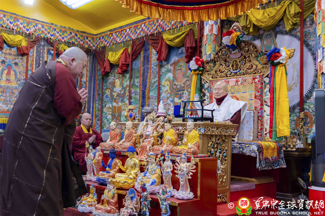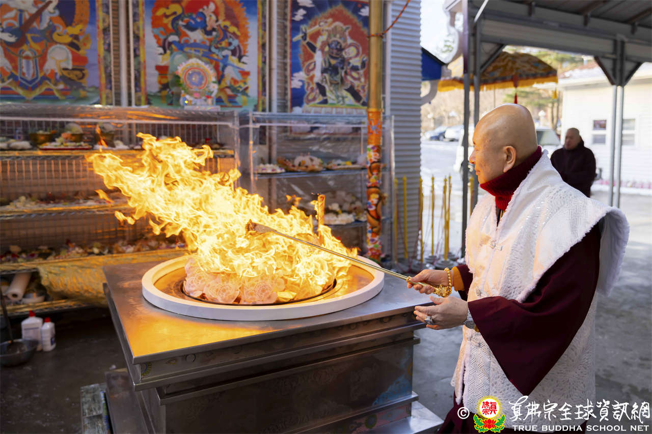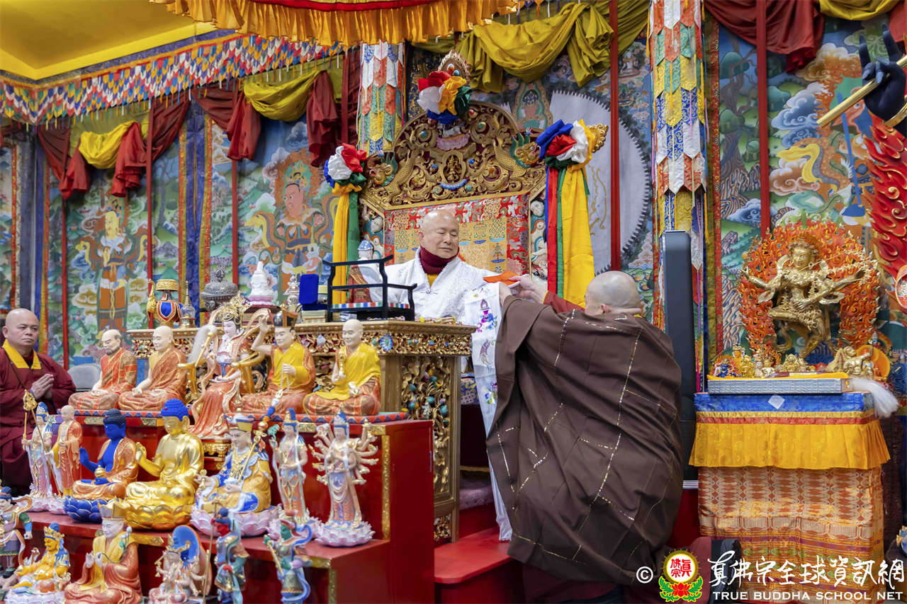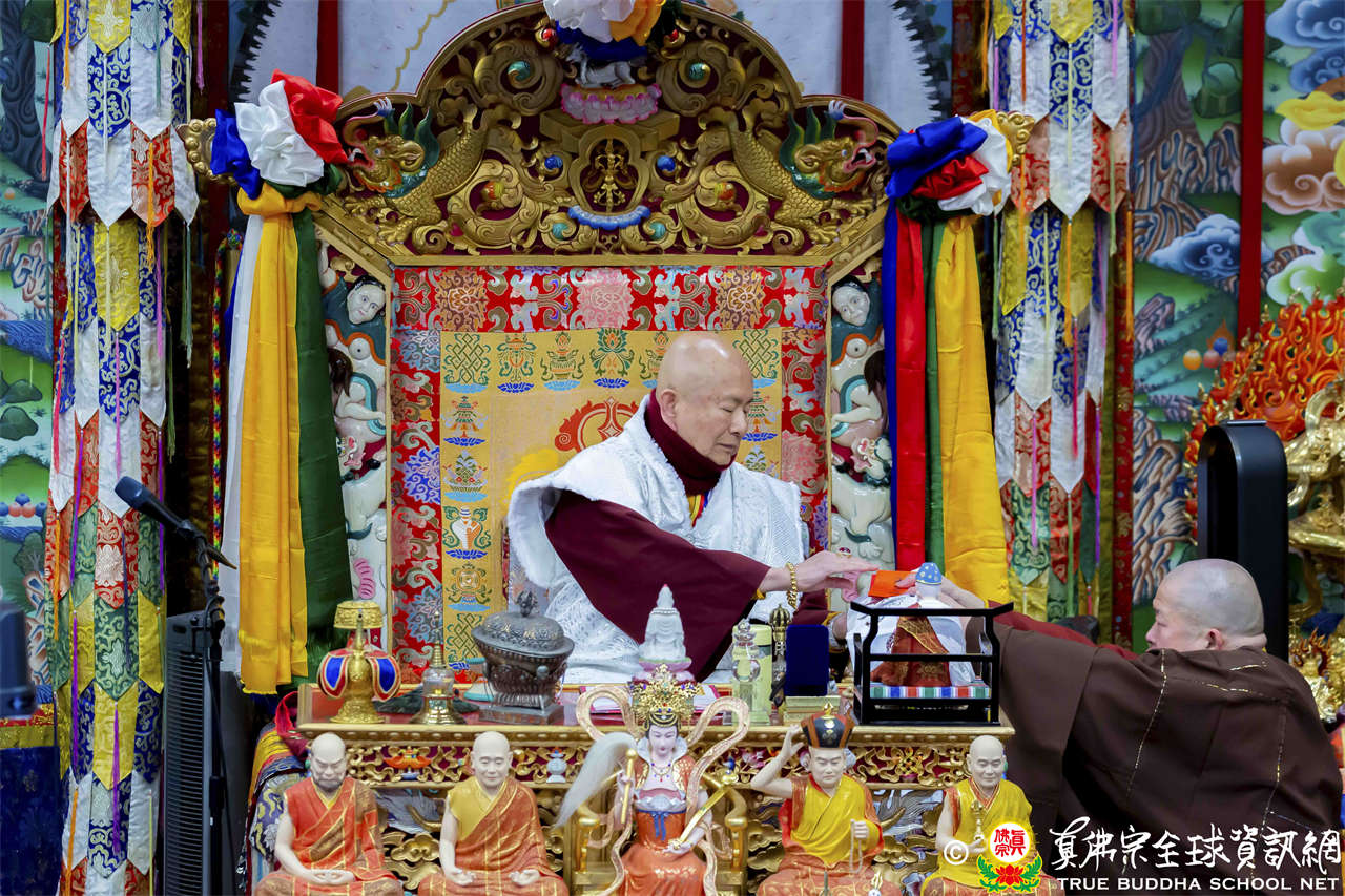 法王開示至此,護摩法會圓滿結束。接著,法王與線上的弟子打招呼,並爲現場出席者賜授觀世音菩薩法灌頂。