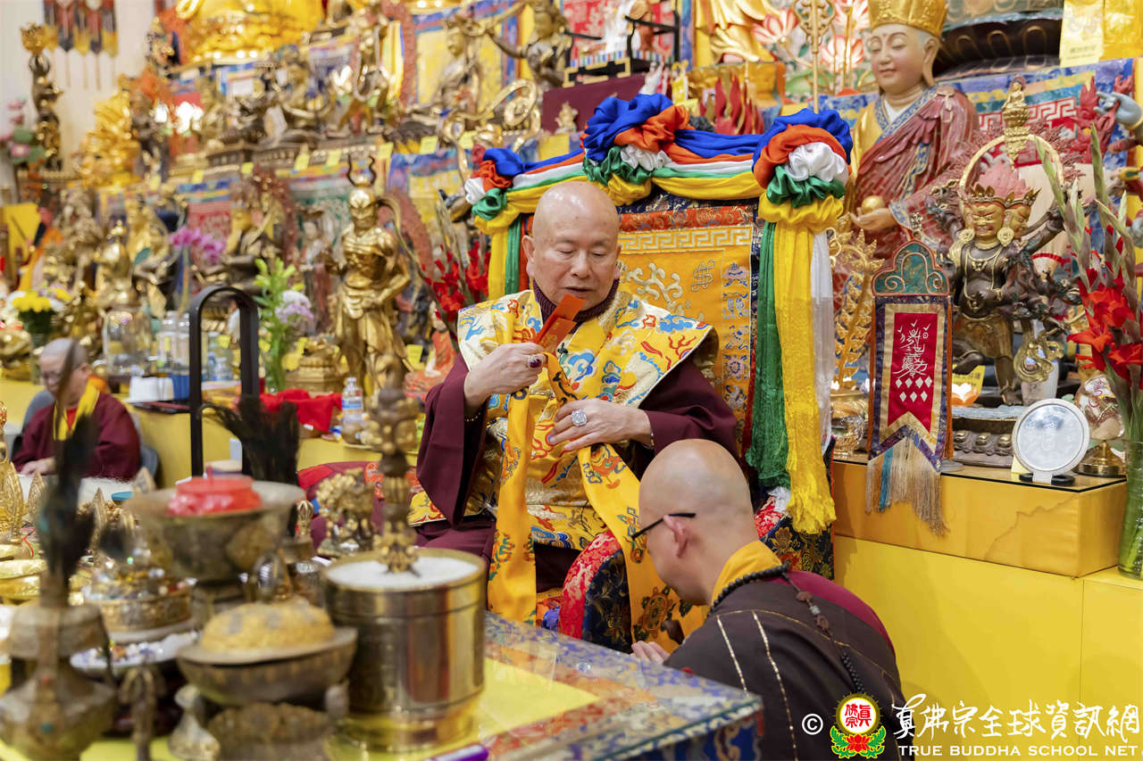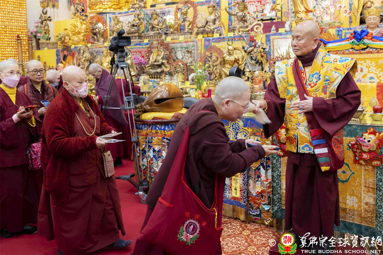 聖尊精彩寶貴的法語開示後,慈悲為新皈依弟子做皈依灌頂,並加持大悲咒水、開光佛像,及持拂塵加持與會大眾。