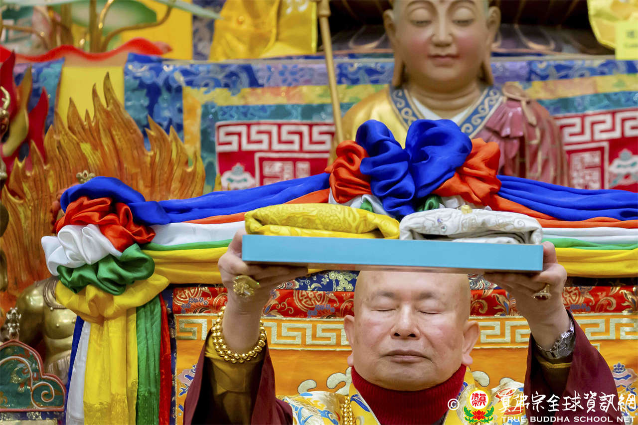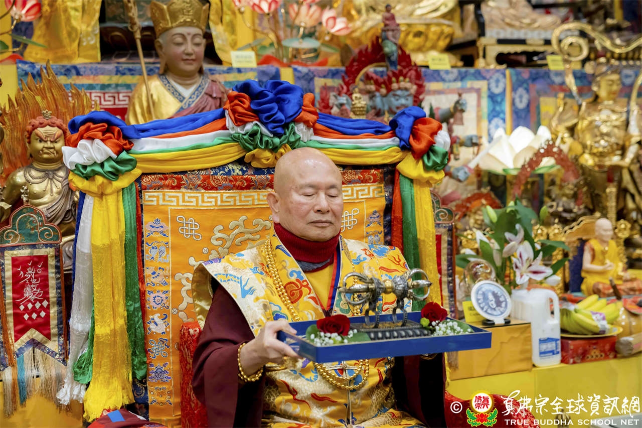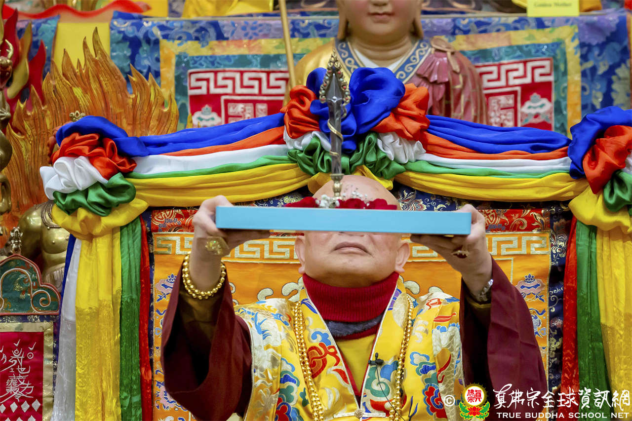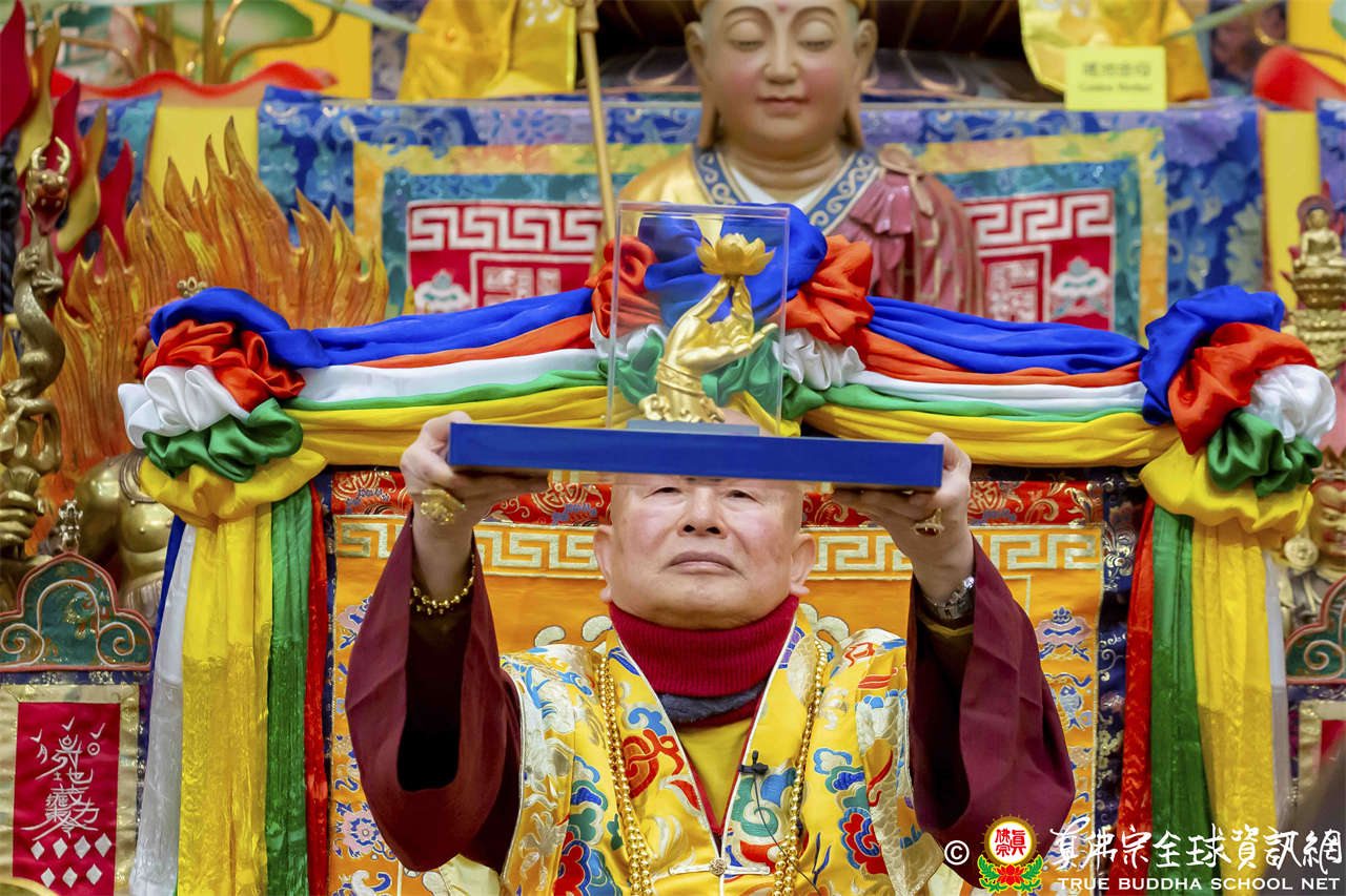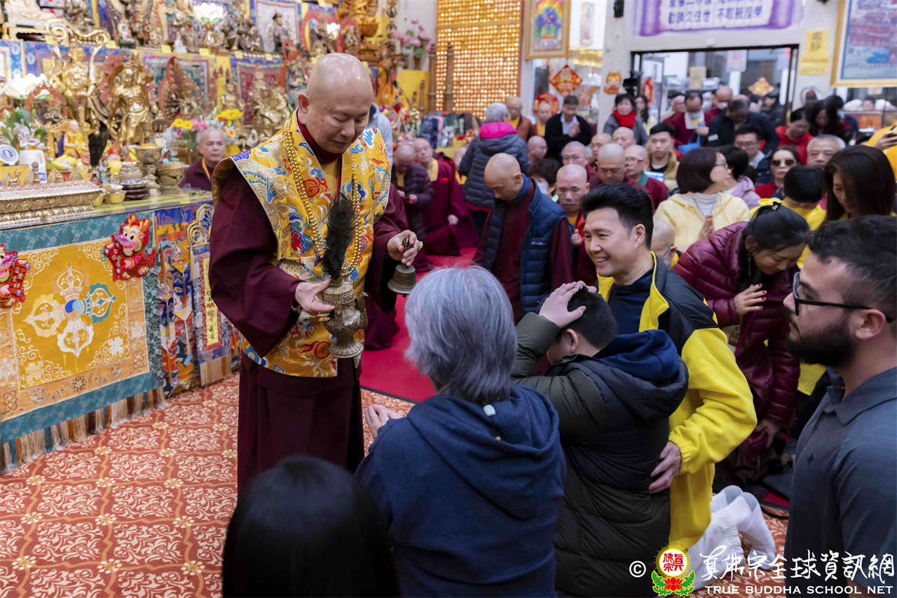因為今天是大年初一,所以特別有這掃把的灌頂幡,這是只有True Buddha School才有的。一掃煩惱輕,二掃過去的霉運全部除掉,三掃業障消,也就是過了這掃把的灌頂幡後,過去的一切全部掃除乾淨,以後就全部是福分來臨,這是今天晚上最重要的。(大眾熱烈鼓掌)