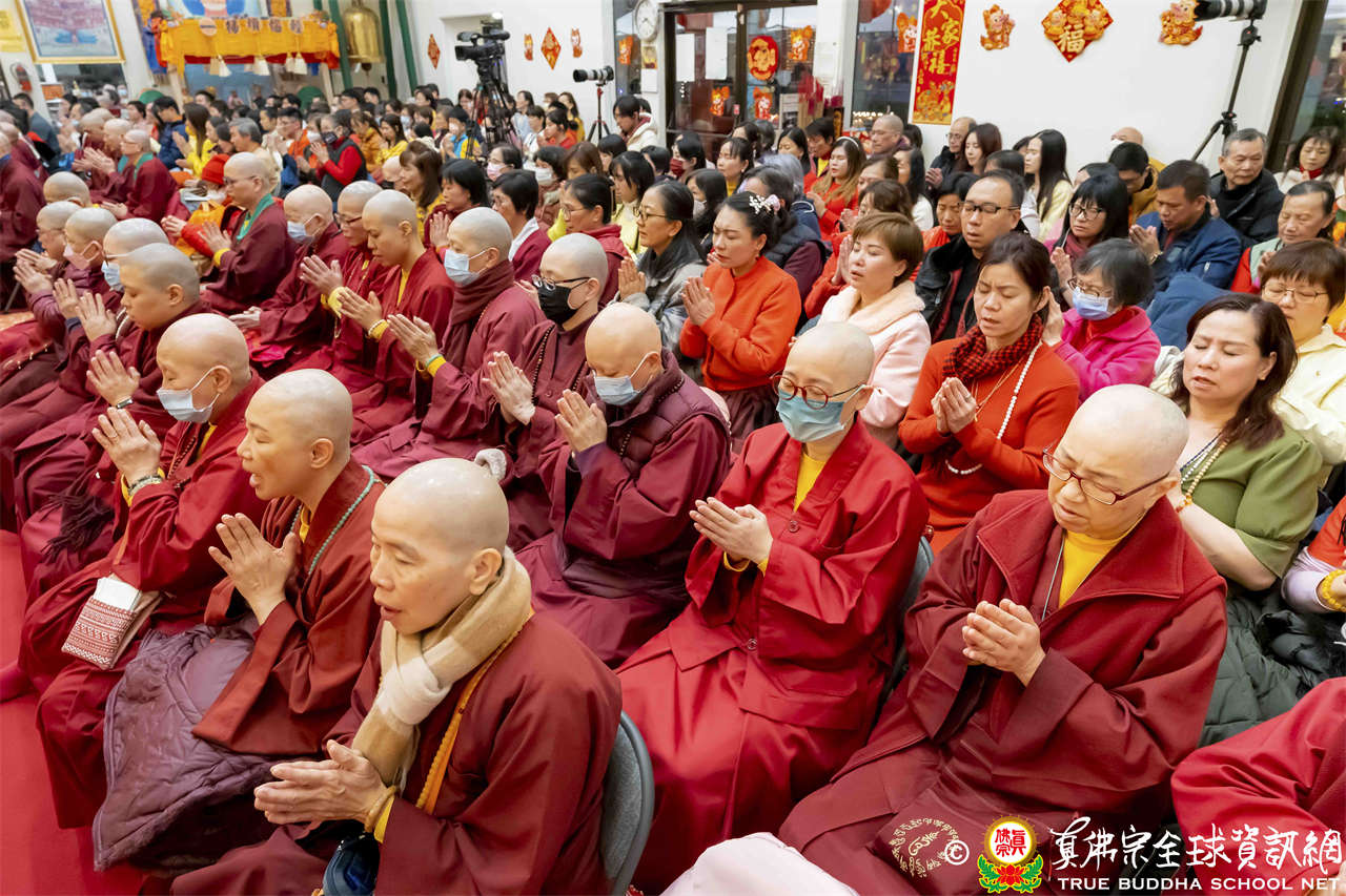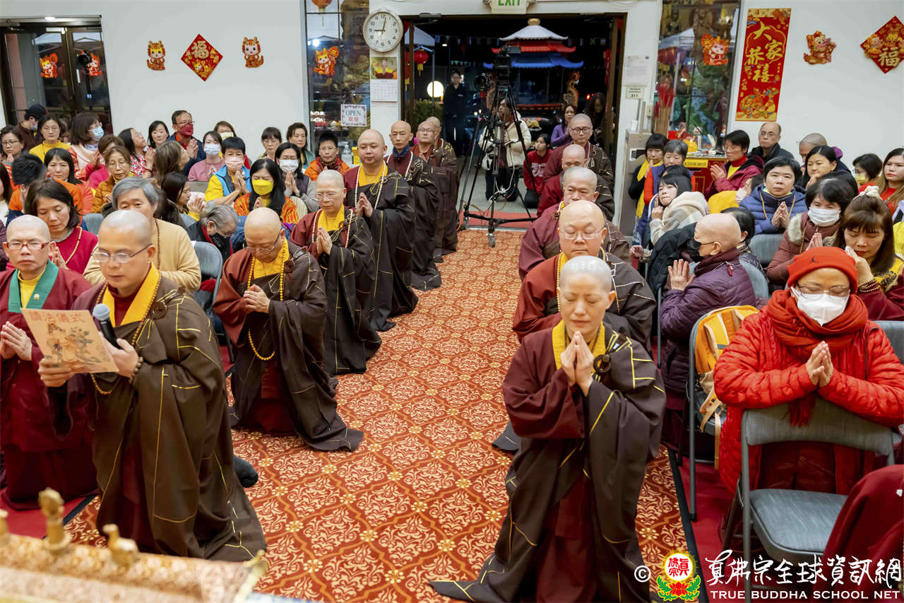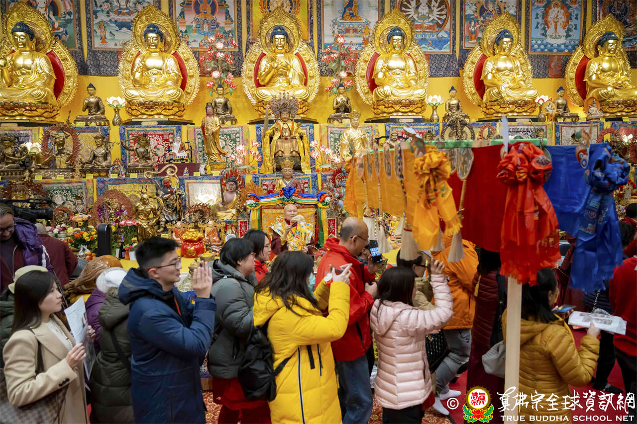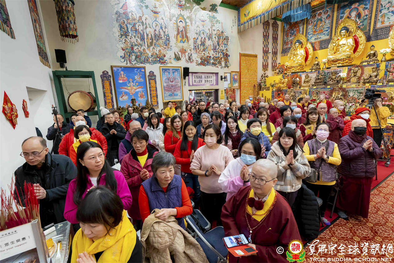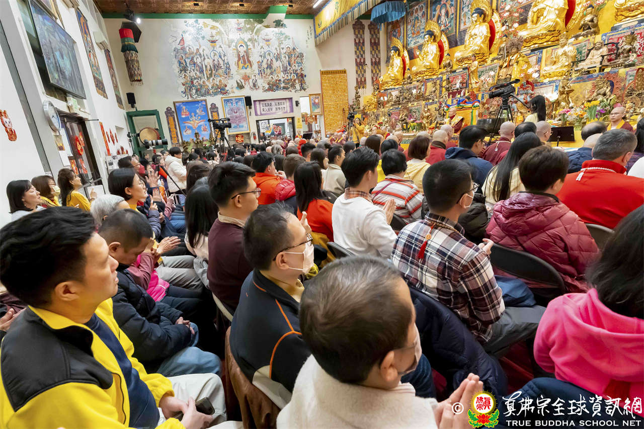 早在除夕之前數個星期,來自世界各地的弘法人員及同門們就不斷湧入西雅圖雷藏寺,滿懷孺慕之情的想和蓮生聖尊盧勝彥、師母一齊歡度除夕及新年。西雅圖雷藏寺張燈結彩,掛滿了喜慶燈籠及各國國旗,並有祝賀詞及吉祥語,希望大眾都有個溫馨難忘的吉祥春節。