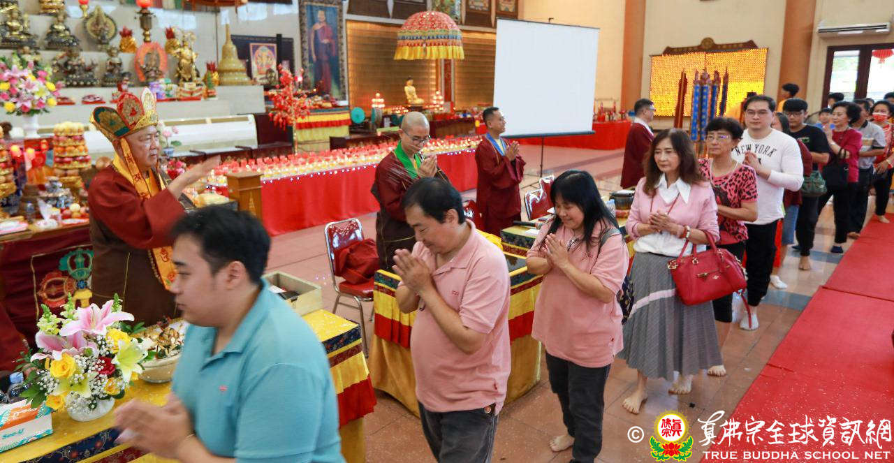同日2月18日下午兩點,是印尼雷藏寺的新春祈福法會。由青年班的迎師組揭開法會序幕,恭迎釋蓮飛上師入道場,主壇佛頂尊勝佛母護摩法會,暨安太歲儀式。釋蓮飛上師到了壇城前,上香後即加持太歲殿及所有光明燈,平安油燈。此次佛頂尊勝佛母法會前一個多月,由釋蓮轟教授師發起眾同門合作持誦尊勝陀羅尼咒十萬遍,功德迴向印尼雷藏寺遠離地水火風等天災。同門都非常努力精進持咒迴向,不到一個月就超過了十萬遍。法會非常殊勝圓滿,上師開示時,特別由蓮轟教授師頒發獎品給三位持咒最多的同門,上師也稱讚蓮轟教授師的發心及努力,印尼雷藏寺近些年常遭水患淹水,尊勝陀羅尼咒的威力果然使印尼雷藏寺平平安安,沒再遭水淹。