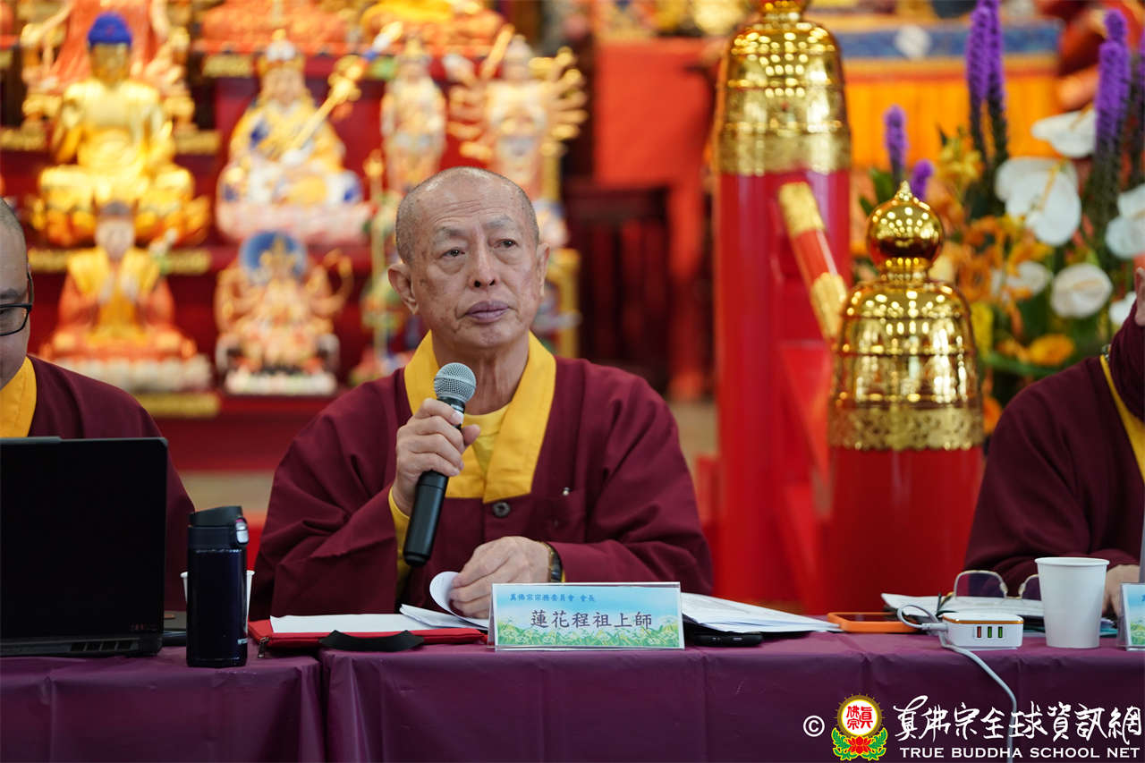 主席宗委會會長蓮花程祖上師於開幕致詞時回顧到,宗委會處長們於2023年巡迴下鄉,先到馬來西亞與馬密總聯辦供僧大會及真佛教育,緊接著到印尼由圓月堂統籌主辦生活營,接著回到新加坡拜訪各道場及拜訪新加坡華光功德會,所到各地皆舉辦了供僧活動。接著是與美國、加拿大及大洋洲宗委會代辦處的線上會議,啟動各地代辦處的服務窗口。再來是宗委會與傳法部及監察會交流會。今年2024年各處長預定行程將到印尼坤甸生活營、新加坡道場巡禮、與馬密總聯辦供僧大會暨真佛教育。接著覆準前期議案,出席上師全體舉手表決通過。